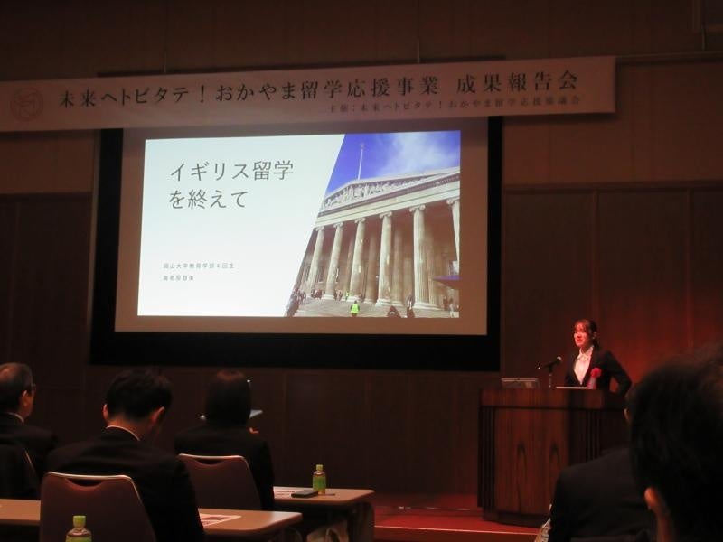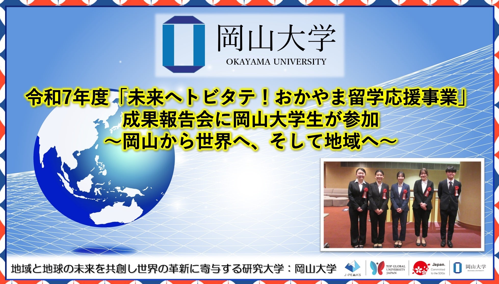 国立大学法人岡山大学(本部:岡山市北区、学長:那須保友)の学生ら4人が2026年2月16日、岡山国際交流センターで開催された「令和7年度 未来へトビタテ!おかやま留学応援事業」成果報告会に参加しました。