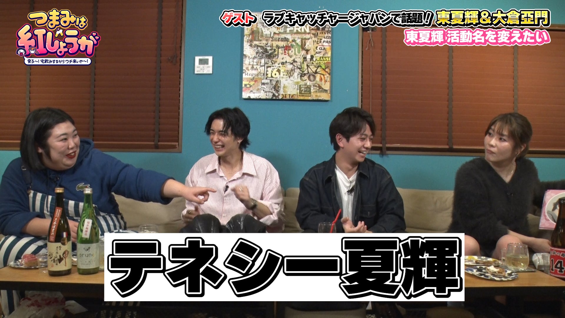 紅しょうがのBSよしもと冠番組『つまみは紅しょうが 男子~!宅飲みするからウチ来ぃや~!』(毎月第3・4月曜24:00~)。2月17日(月)放送の♯15では、ゲストに『LOVE CATCHER Japan』に出演し、話題になった東夏輝と大倉亞門が登場します。