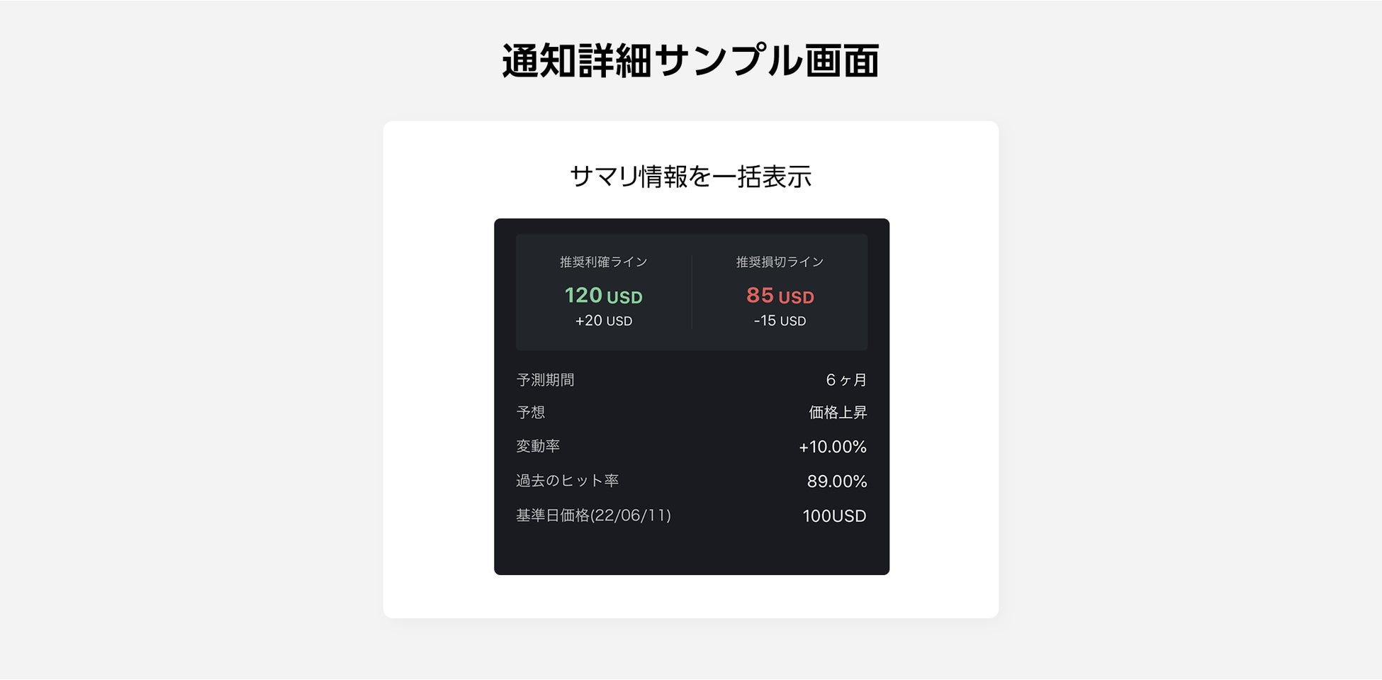 LINEのメッセージ内のリンクから直接取引画面にアクセスすることができ、LINEで通知を受け取り、銘柄の予測結果を元に、シームレスに取引いただくことが可能です。