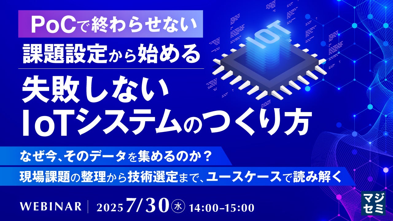 マジセミ株式会社は「【PoCで終わらせない】課題設定から始める、失敗しないIoTシステムのつくり方」というテーマのウェビナーを開催します。