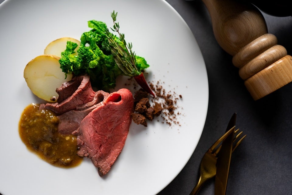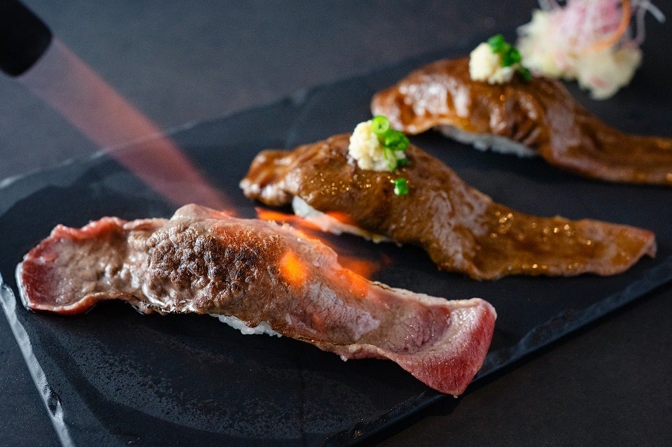 十勝ハーブ牛のローストビーフ/黒毛和牛の炙り寿司