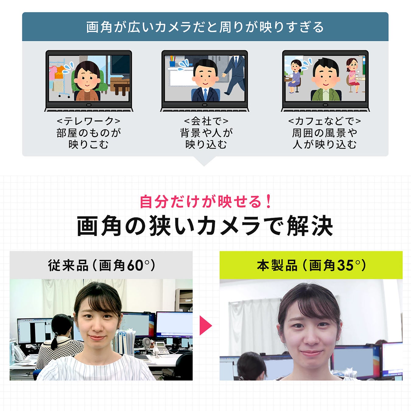 本製品は、画角が35度の狭角WEBカメラです。画角が狭いので、弊社狭角WEBカメラ(65度)と比較して背景が映りづらくなっています。
