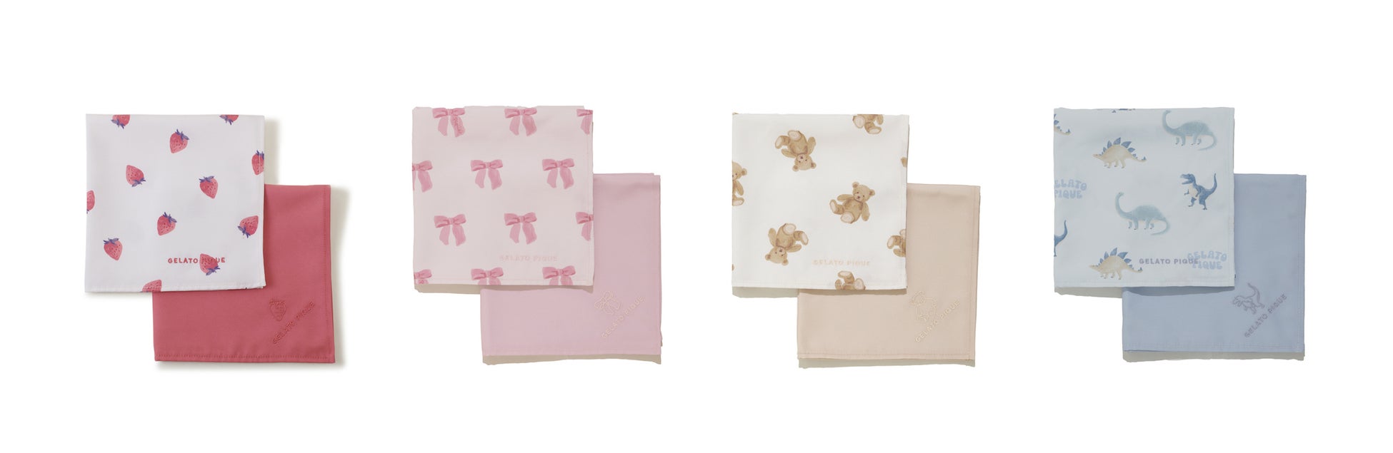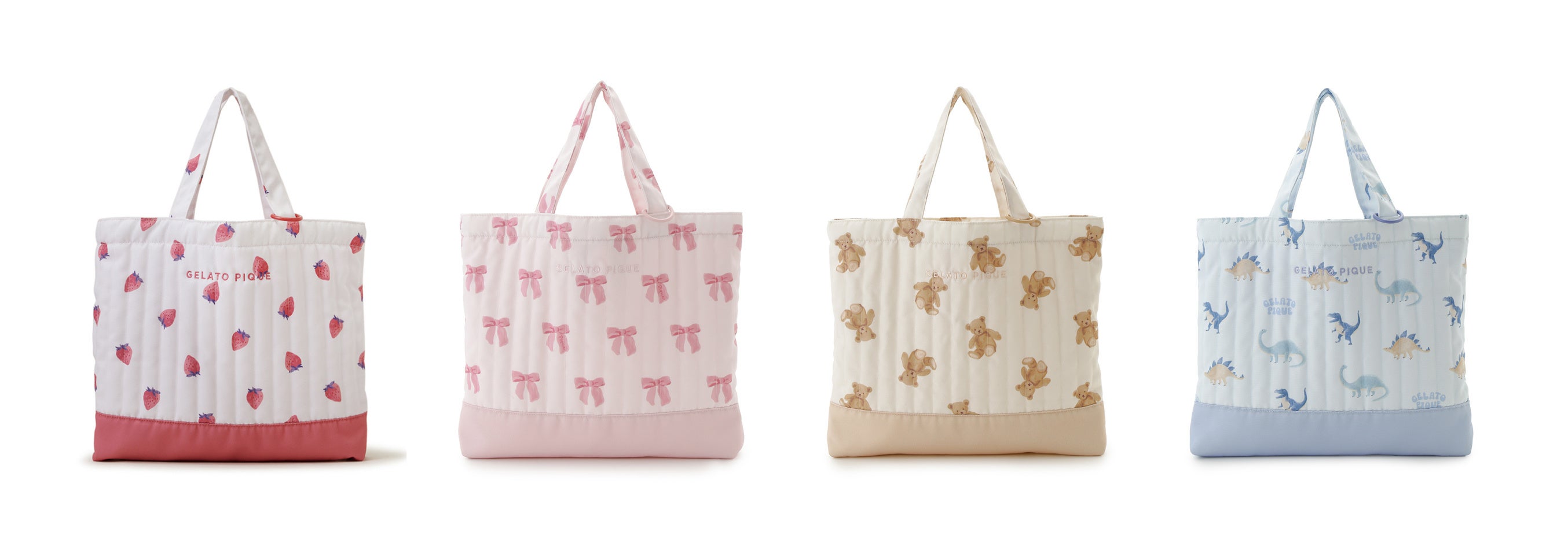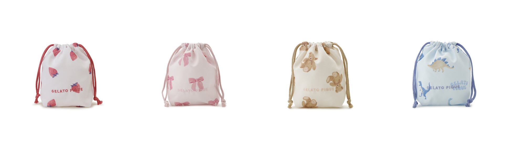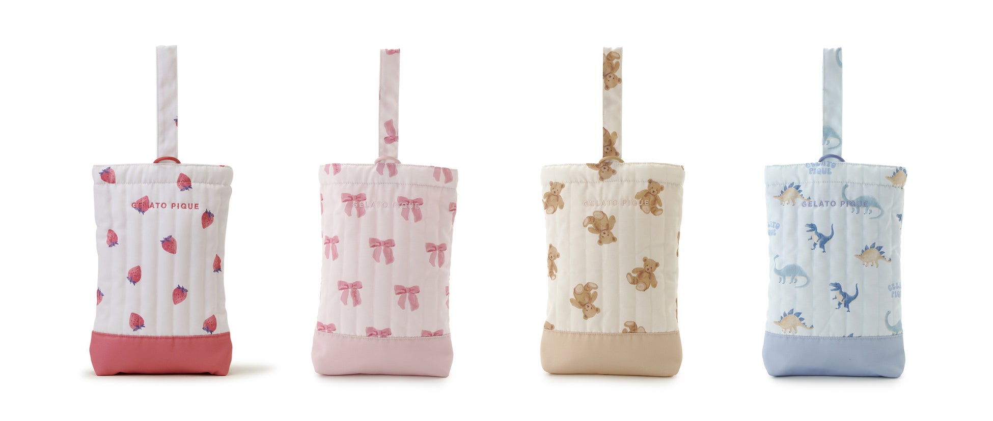 入園・入学や新学年のスタートを彩る〈ストロベリー・リボン・ダイナソー・ベア〉の4つのモチーフをラインアップ。今年は生地に撥水加工を施し、より使いやすくアップデートしました。