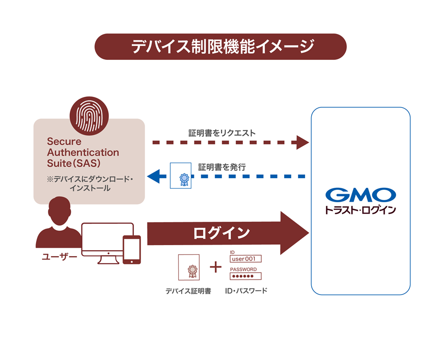 「デバイス制限機能」を利用すると、ユーザーが利用するデバイスの個体情報(MACアドレス等)に紐づく証明書をGMOトラスト・ログインが発行します。発行された証明書とID、パスワードを組み合わせた場合のみ、GMOトラスト・ログインと、連携する各クラウドサービスにログインが可能となります。