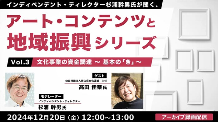 株式会社クリーク・アンド・リバー社(C&R社)は、12月20日(金)に、今年7月に開催したオンラインセミナー「インディペンデント・ディレクター杉浦幹男氏が聞く、アート・コンテンツと地域振興シリーズvol.3 文化事業の資金調達〜基本の『き』~」のアーカイブ映像を無料配信します。