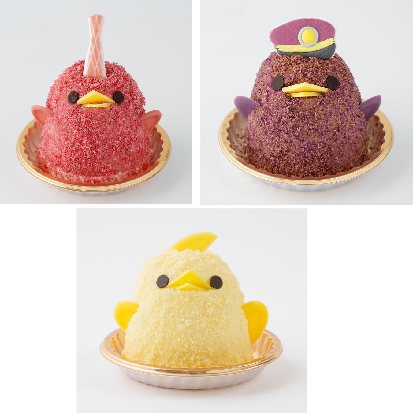 名古屋名物の人気スイーツ・ぴよりんと、神戸ポートタワー、阪急電車それぞれがコラボ。赤色の本体の頭部に神戸ポートタワーのアイシング、マルーンカラーの本体の頭部に阪急電車車掌帽子のアイシングをトッピングします。