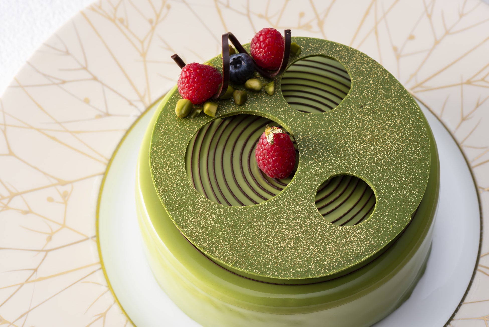 華やかなグリーンのグラサージュで艶やかに仕上げた、ピスタチオとベリーのクリスマスケーキ。ロイヤルティーヌとアーモンドの生地を底に敷き、香ばしいピスタチオのムースと生地に、甘酸っぱいベリージャムを幾層にも重ねました。枯山水を思わせるケーキの上には、繊細な抹茶のチョコレートをあしらい、パリッとした食感がアクセントに。上品なピスタチオの香りとベリーの酸味が調和した爽やかな味わいは、特別な夜を優雅に彩ります。