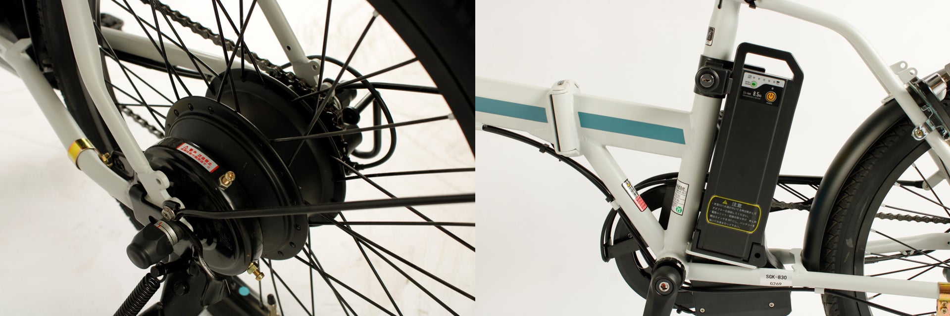 後輪に内蔵されたモーター、8.5Ahのリチウムイオンバッテリーを搭載し、1回の充電で約36kmの走行が可能※。6段変速と組み合わせて様々なシチュエーションに対応。※自転車業界統一テスト条件 標準パターン