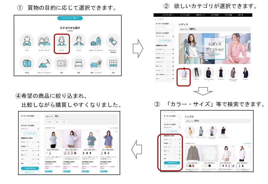 スムーズに欲しい色やサイズの商品、セール限定品にたどり着けるよう、商品検索に「カラー・サイズ」「セール」といった条件での絞り込み機能を加えたほか、比較購買しやすい表示へと改善しています。