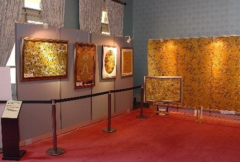 れた金唐紙の絵柄を展示します。また、金唐紙の技術を用いた絵画を施した額絵やパネル、茶席で使用される風