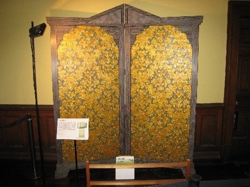 炉先屏風なども展示いたします。絢爛豪華な金唐紙の世界を、当時の雰囲気に浸りお楽しみください。