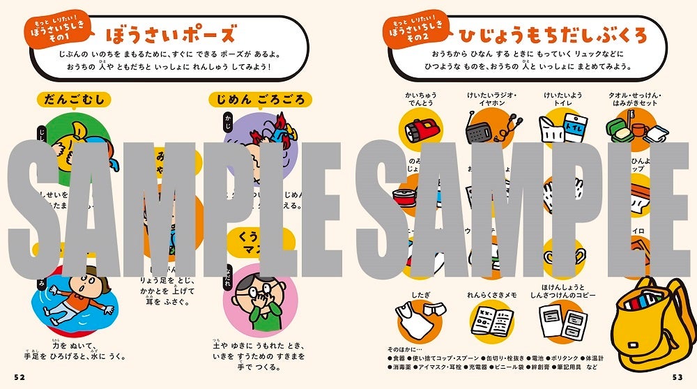 本書を監修したのは、『ひるおび!』や『羽鳥慎一モーニングショー』出演でおなじみの防災システム研究所所長・山村武彦氏。イラストは、サイゼリヤキッズメニュー間違い探しでおなじみのthe rocket gold star氏。防災に対する心構えや、実際に災害が起きたときにとるべき行動を35のルールとしてまとめています。また、ひと目でわかって楽しい「すごろく風ルールチェックリスト」や、防災ポーズ集や非常持ち出し袋持ち物リストを掲載。保護者向けページでは「避難情報」の整理や災害用伝言ダイヤルについても解説しており、保護者が見てもためになる情報が満載です。