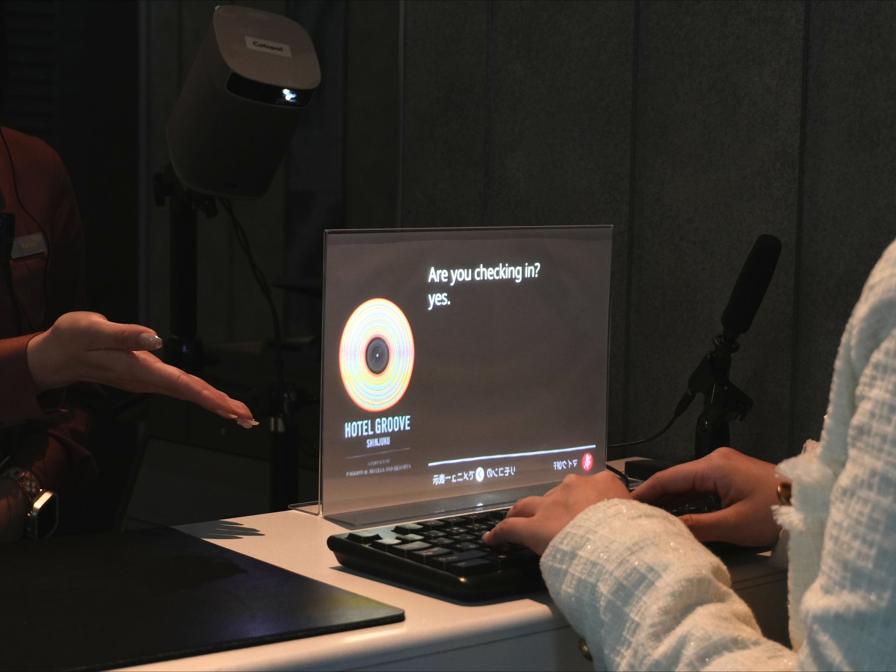レセプションデスクには、音声をリアルタイムで認識し、文字‧図解‧動画をスクリーンに表示するシステムを導入。会話の聞き取りづらさを解消し、コミュニケーションを円滑化します。