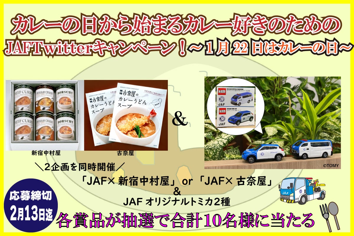 JAF(一般社団法人 日本自動車連盟)東京支部(支部長 加藤 和夫)は、1月22日(土)から『カレーの日から始まるカレー好きのためのJAFTwitterキャンペーン~1月22日はカレーの日~』を開催します。