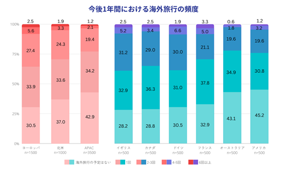今後1年間における海外旅行の頻度に関しては、エリア別に見ると、北米では63.1%、ヨーロッパでは69.4%、APACでは56.9%が「1回以上」(1回・2~3回・4~5回・6回以上を合算)と回答した(図4)。国別に見てみると、イギリス・ドイツ・フランス・カナダでは「2回以上」の回答が3~4割を占めており、海外旅行に対する意欲の高さがうかがえる。また、欧米圏では「海外旅行の予定はない」がアメリカ・オーストラリアで4割程度に留まっている一方で、前回のアジアにおける調査結果では日本(88.6%)とインドネシア(73.2%)で7割以上が「海外旅行の予定はない」と回答しており、アジアではまだ海外旅行に慎重な声が多いと考えられる。