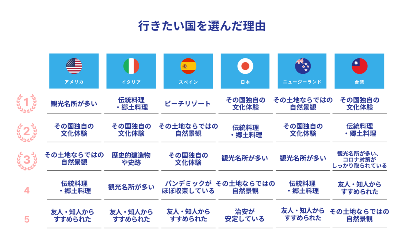 そのほか、ニュージーランドを選んだ理由は「独自の自然景観」(23.3%)、「独自の文化体験」(16.2%)、「観光名所が多い」(15.7%)、台湾を選んだ理由には「独自の文化体験」(29.6%)、「伝統料理」(29.4%)の回答が多かった。