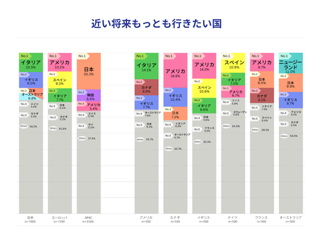 近い将来もっとも行きたい国を聴取したところ、北米ではイタリア(10.5%)、イギリス(9.0%)、オーストラリア・日本(同率6.8%)(※3)、ヨーロッパではアメリカ(10.2%)、スペイン(9.3%)、イタリア(7.7%)が上位3カ国を占める結果となった。一方、APACでは日本(20.3%)、韓国(6.6%)、アメリカ(5.4%)が上位3カ国にランクインしている。国別に見ると、アメリカではイタリア(14.1%)が、イギリス・フランス・カナダではアメリカが(14.2%・9.7%・18.8%)、ドイツではスペイン(10.9%)が、オーストラリアではニュージーランド(11.0%)が行きたい国1位という結果になった(図1)。ちなみに、前回行ったアジア10カ国における海外旅行調査では、日本はアメリカ・台湾(同率)、それ以外の9カ国・地域は日本が行きたい国1位という結果となっている。
