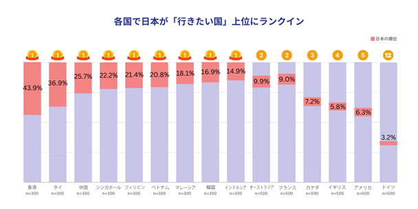 なお、意識調査第2弾では、アメリカ・カナダ・イギリス・フランス・オーストラリアの5カ国において、もっとも行きたい国5位以内にアジアの中で唯一、日本がランクインしている(図3)。行きたい国に日本を選んだ回答者を対象に、日本を訪れたらどんな体験をしたいかという質問に対しては、全体では「日本食を食べる」「自然・景勝地の観光」「歴史的建造物の観光」「四季を体感」「ギャラリーや美術館を訪れる」が上位5位となった。さらに、「農山漁村体験」への関心も各国において高いほか、アメリカ・カナダでは「ポップカルチャー体験」への票が多く、オーストラリアでは「温泉」「ショッピング」の回答が多数見られた。