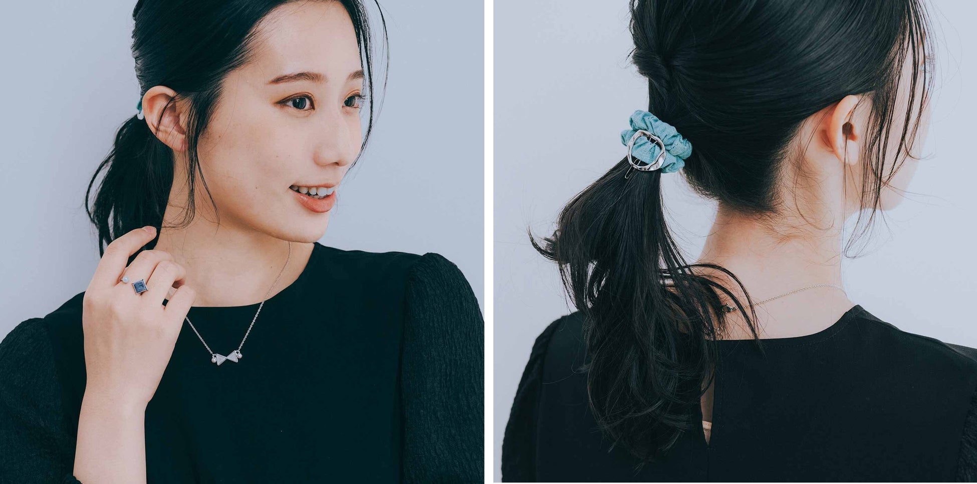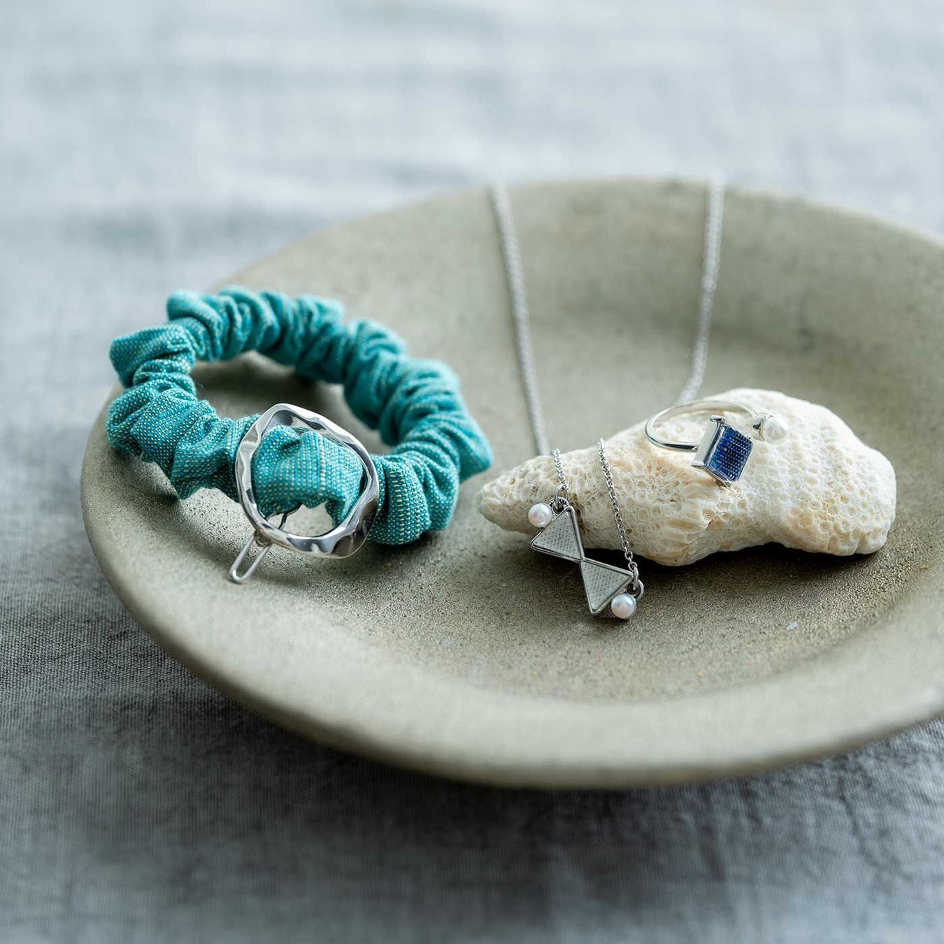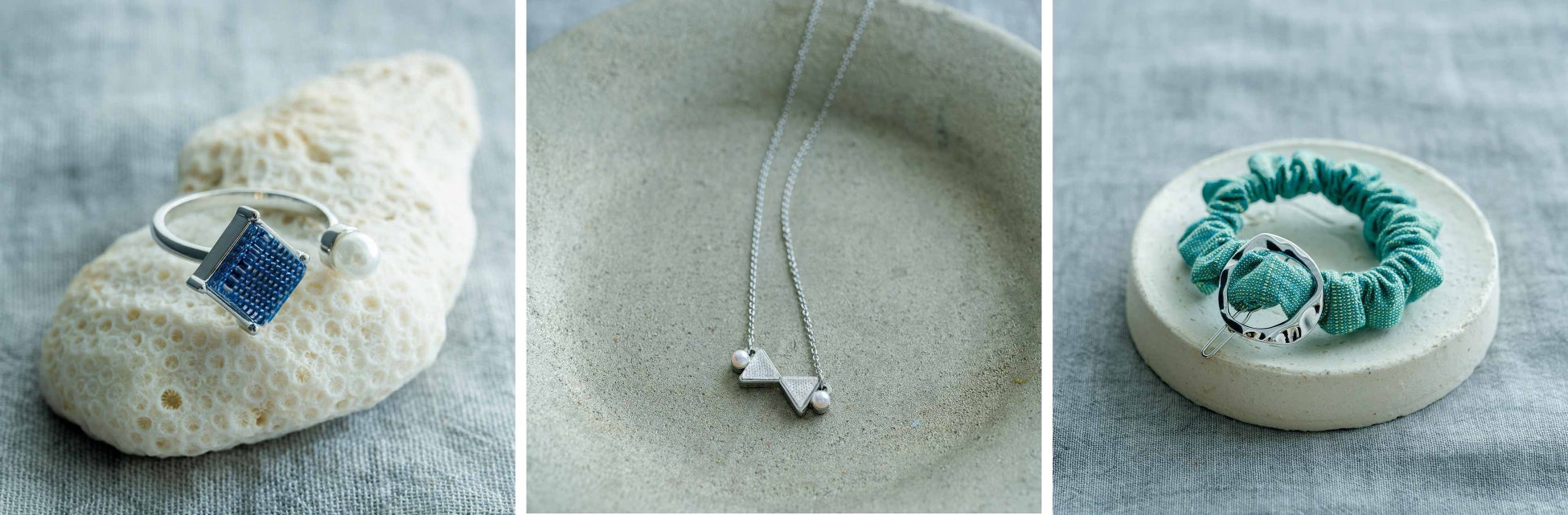 いつでも自分のいちばん近いところで存在感を輝かせ、魅力と自信を高めてくれる、会津木綿のリングとネックレスとシュシュ。今日のわたしについてきてくれる“あいぼう”みたいな、手のひらサイズのかわいい味方です。