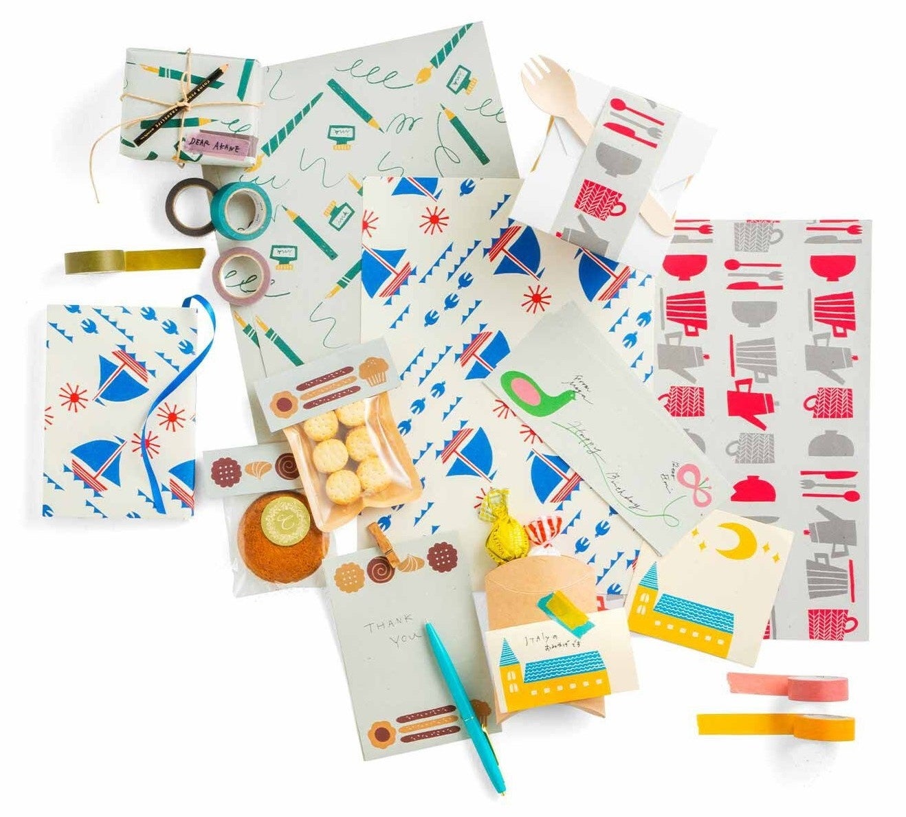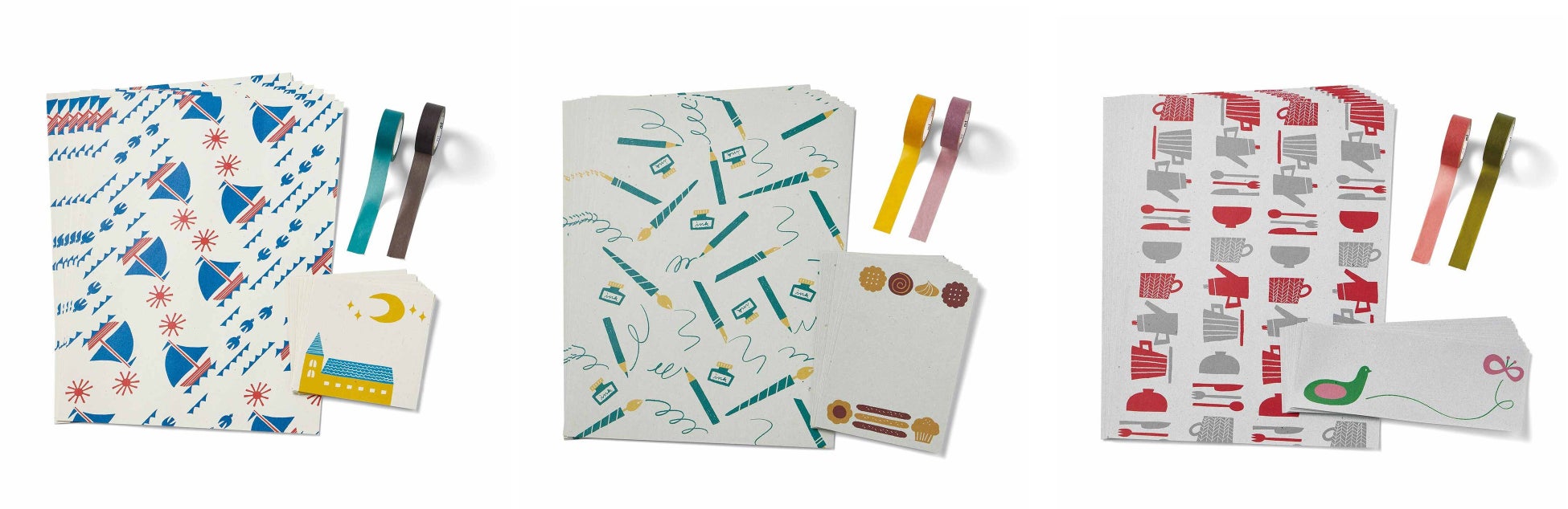 お申し込みいただくと、A4ペーパ10枚(同柄)、メッセージペーパー24枚(同柄)、マスキングテープ2個(色違い)のセットを毎月1回、お届け内容を変えて、1セットずつ、3回お届けします。