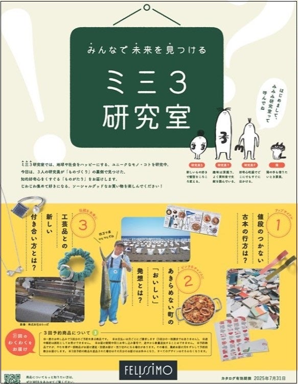 フェリシモは、このたび新ブランド「ミ三3(みみみ)研究室」を立ち上げました。「ミ三3(みみみ)」には「みんなで未来を見つける」の意味を込めています。今世の中で起こっている新しい取り組みや、未来に残したい習慣や文化、そして日常のふとしたウェルビーイングな気づきから生まれた商品を、3人の研究員が発表する取り組みです。「ものがたりがないとつまらないでしょ!」研究員が大切にしているのは「モノ+がたり」のある「モノ+づくり」。一つ一つの商品に「ストーリー(ものがたり)」があるのが特徴です。新しいものがたりに「出会って・楽しんで・ちょっと考える!?」そんな知的好奇心をくすぐる「ミ三3研究室」が、2025年2月15日、3つの「研究レポート」というかたちで、商品を発表しました。