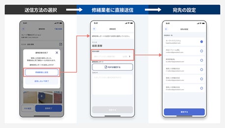 ②アプリ上で不動産管理会社がホープハウスシステムや任意で登録した修繕業者へ送信