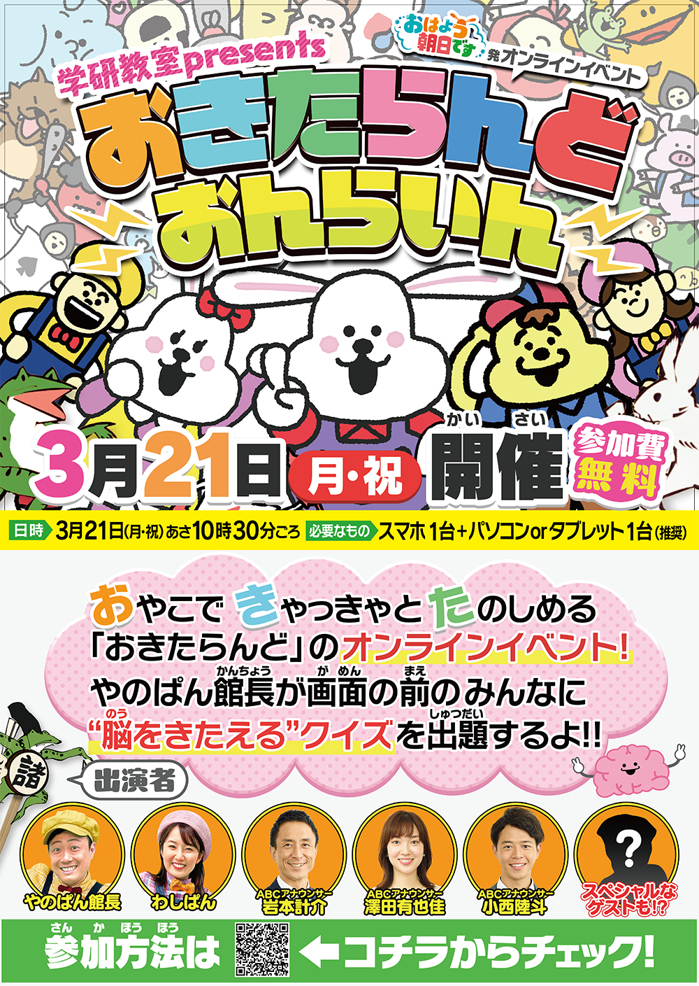 株式会社 学研ホールディングス(東京・品川/代表取締役社長:宮原博昭)のグループ会社、株式会社 学研エデュケーショナル(東京・品川/代表取締役社長:川端篤)は、ABCテレビ「おはよう朝日です」の人気コーナー「おきたらんど」とコラボレーションした参加型の子ども向けオンラインイベント「学研教室presents おきたらんどおんらいん」を3月21日(月・祝日)に開催します。
