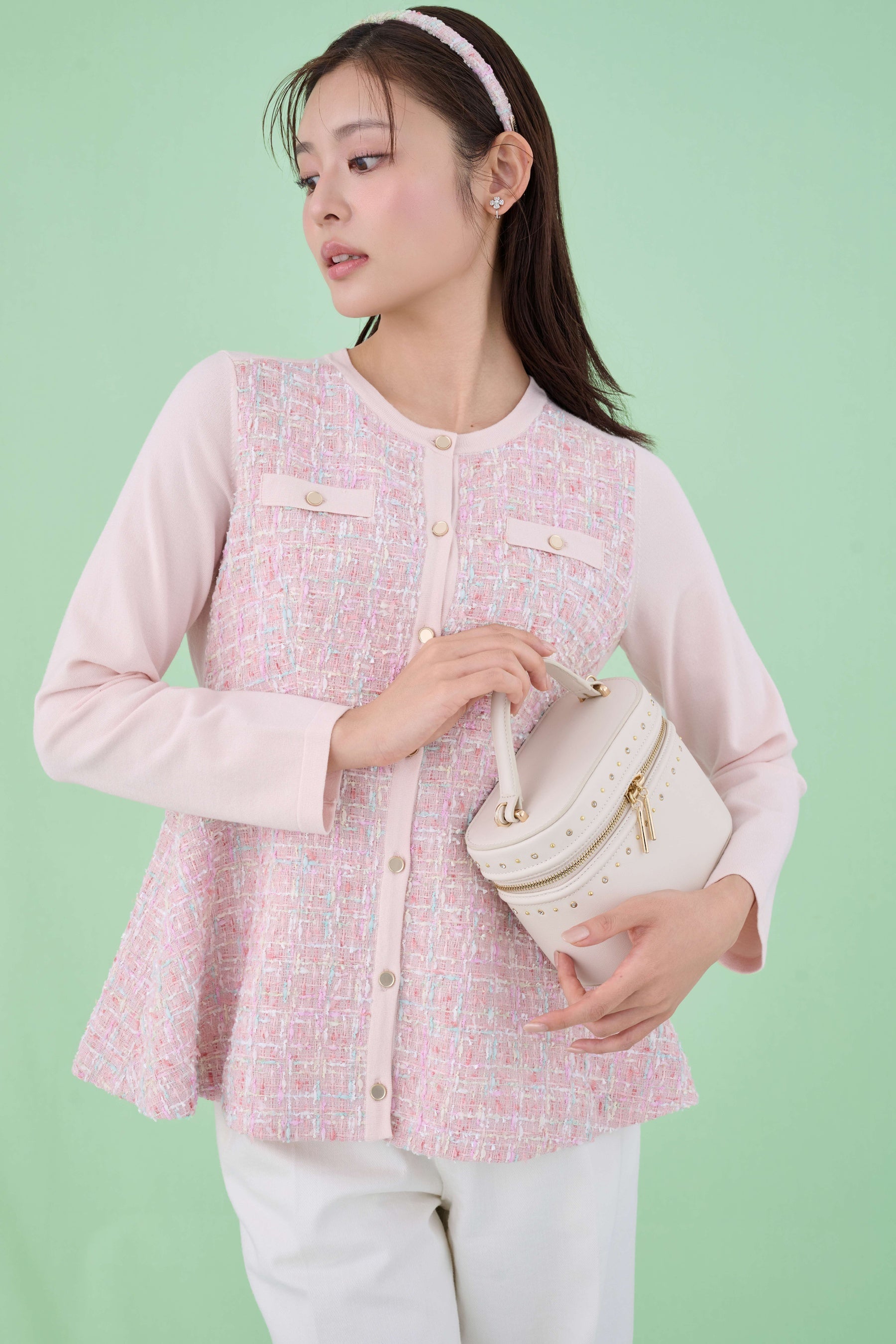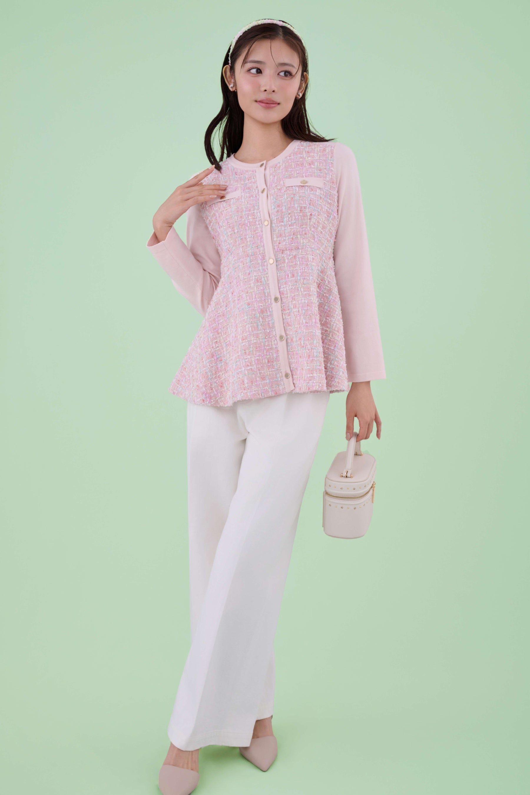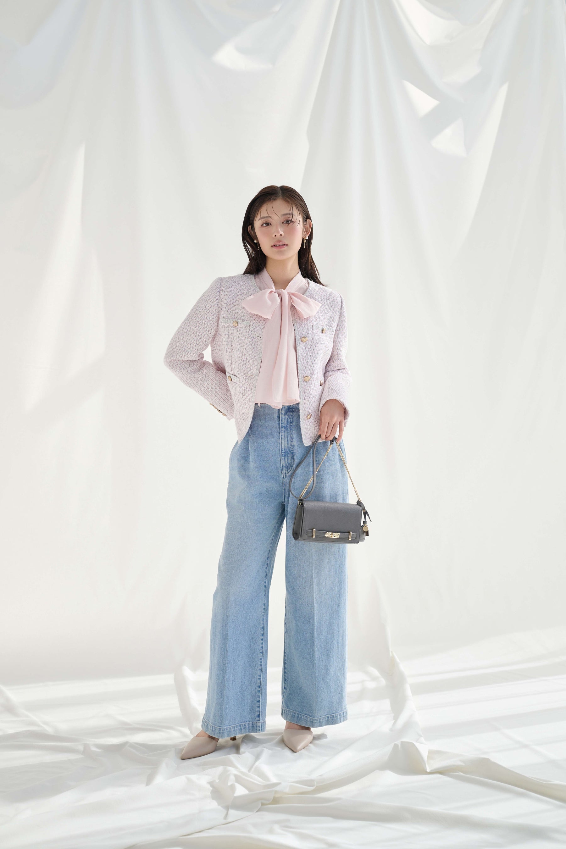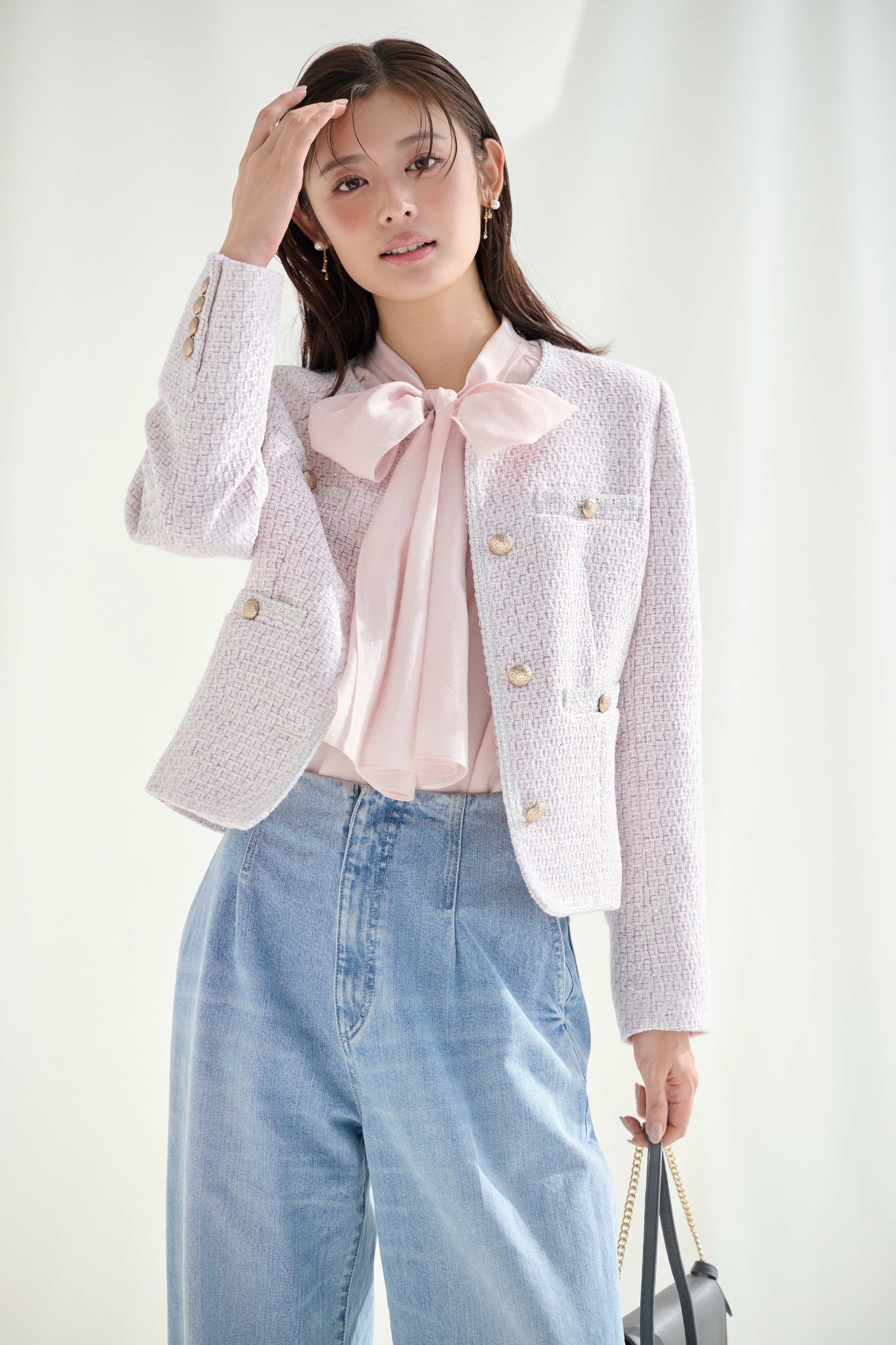 まろやかなピンクが溶け込むジャケットで春の光に映える華やぎを