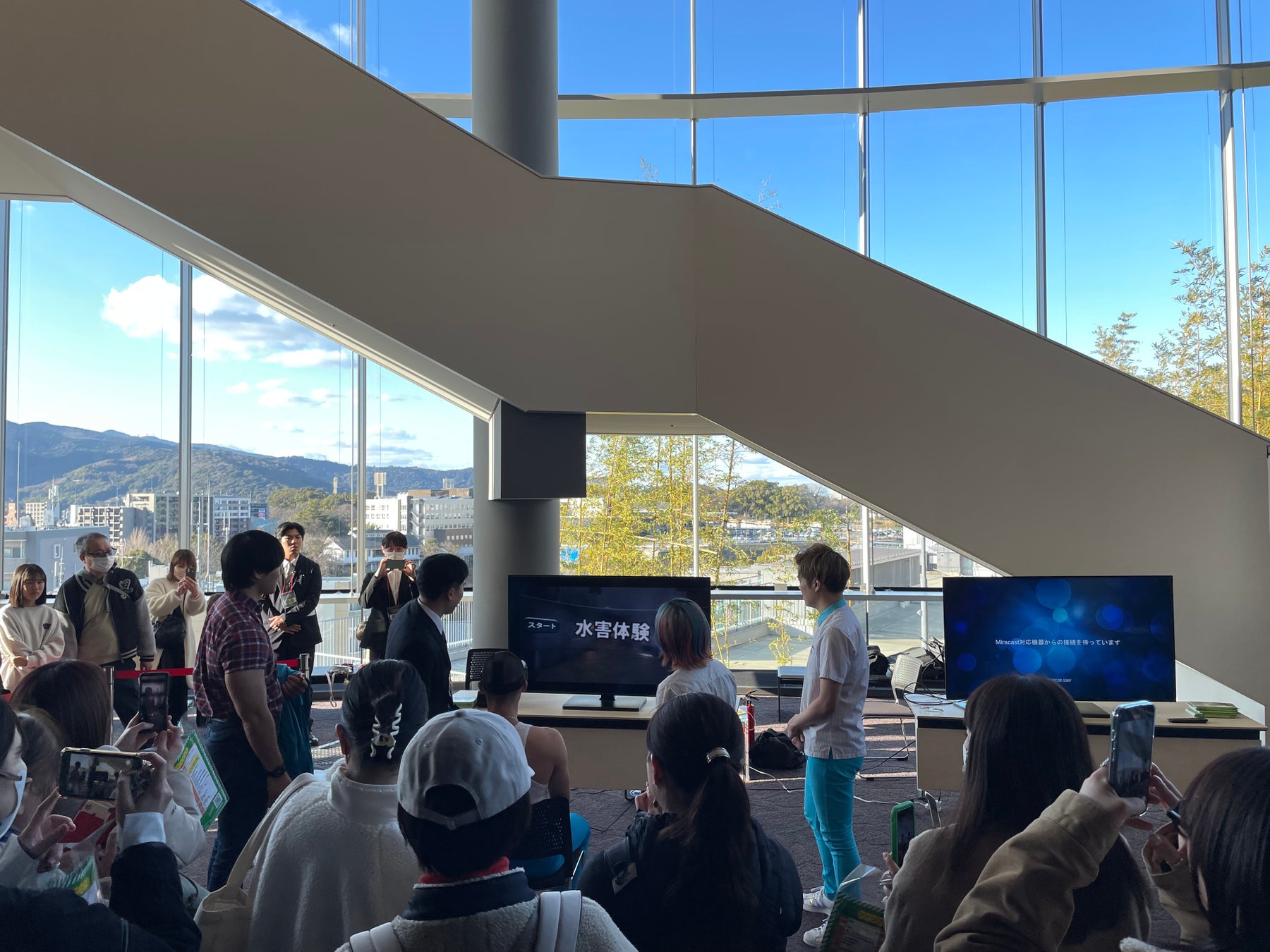 展示エリアでは、防災用品のコーナー、防災パネル展、バーチャル災害体験コーナーなど、多くの無料コンテンツが用意されました。VR(仮想現実)やAR(拡張現実)を活用した体験コーナーでは、商業施設で買い物中に地震が起きた場合の避難体験をしたEverybody・かわなみchoy?は散乱する商品などを見て「大変だ。これは事前に知っておかないと」と慌てないことの重要性を実感しました。