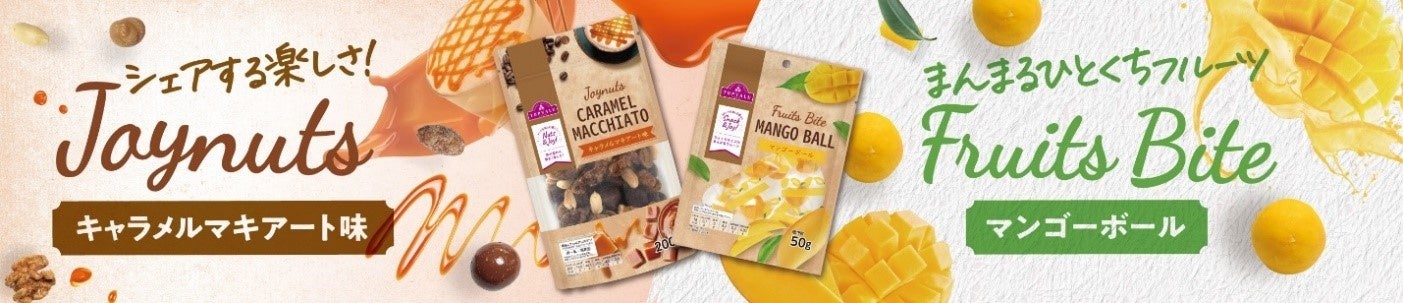6種類のナッツをまとめて一緒に頬張るとキャラメルマキアートの味になる新感覚ナッツやひと口サイズでいつでもどこでも食べやすいマンゴードライフルーツが登場