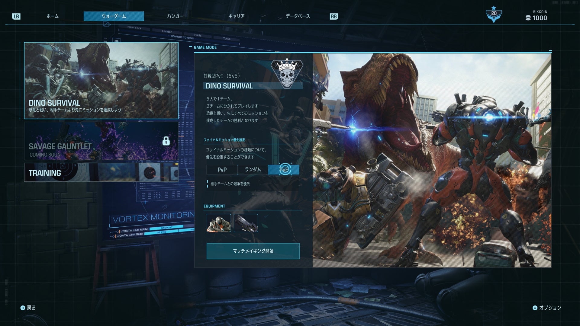 ゲームを進めていくと「ディノサバイバル」のマッチングを行う際に、ファイナルミッションをPvP/PvE/ランダムの3つの種類から選んでマッチングが可能となる。一部の例外はありますが、PvEを選んだプレイヤーはファイナルミッションにおいて「プレイヤーが操作するエグゾスーツとの直接的な戦闘が発生せず、ミッションのクリア速度で勝敗を競い合う」内容になる。