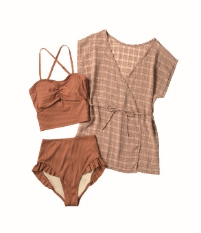 トレンドのシアートップスとリブ素材の水着で大人なスタイルを演出します。