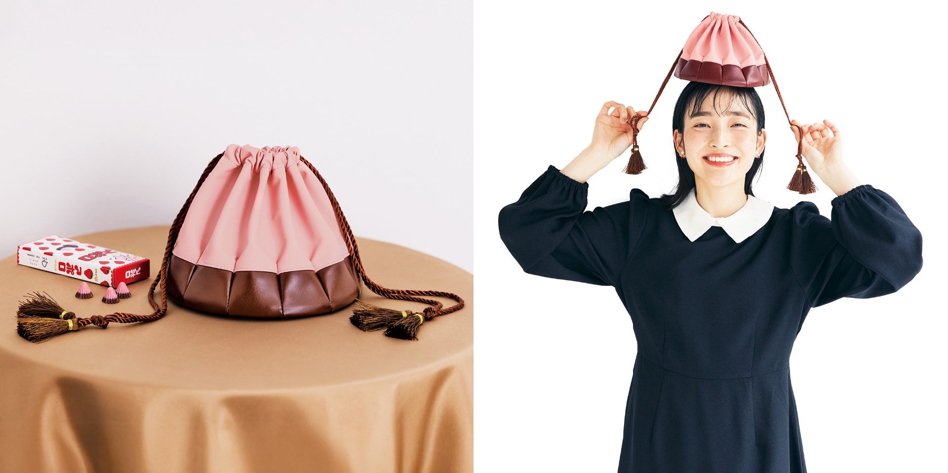アポロのキュートな見た目をそのまま形にした、アポロチョコ約1000粒分サイズのきんちゃくバッグです。工場に確認して底面の直径をアポロチョコひと粒の10倍にするなど、かわいいながらもこだわって作られています。いちごチョコとチョコレートの絶妙なバランスを上品な質感の2色の合皮を組み合わせて再現し、大人っぽく仕上げられているのも魅力です。