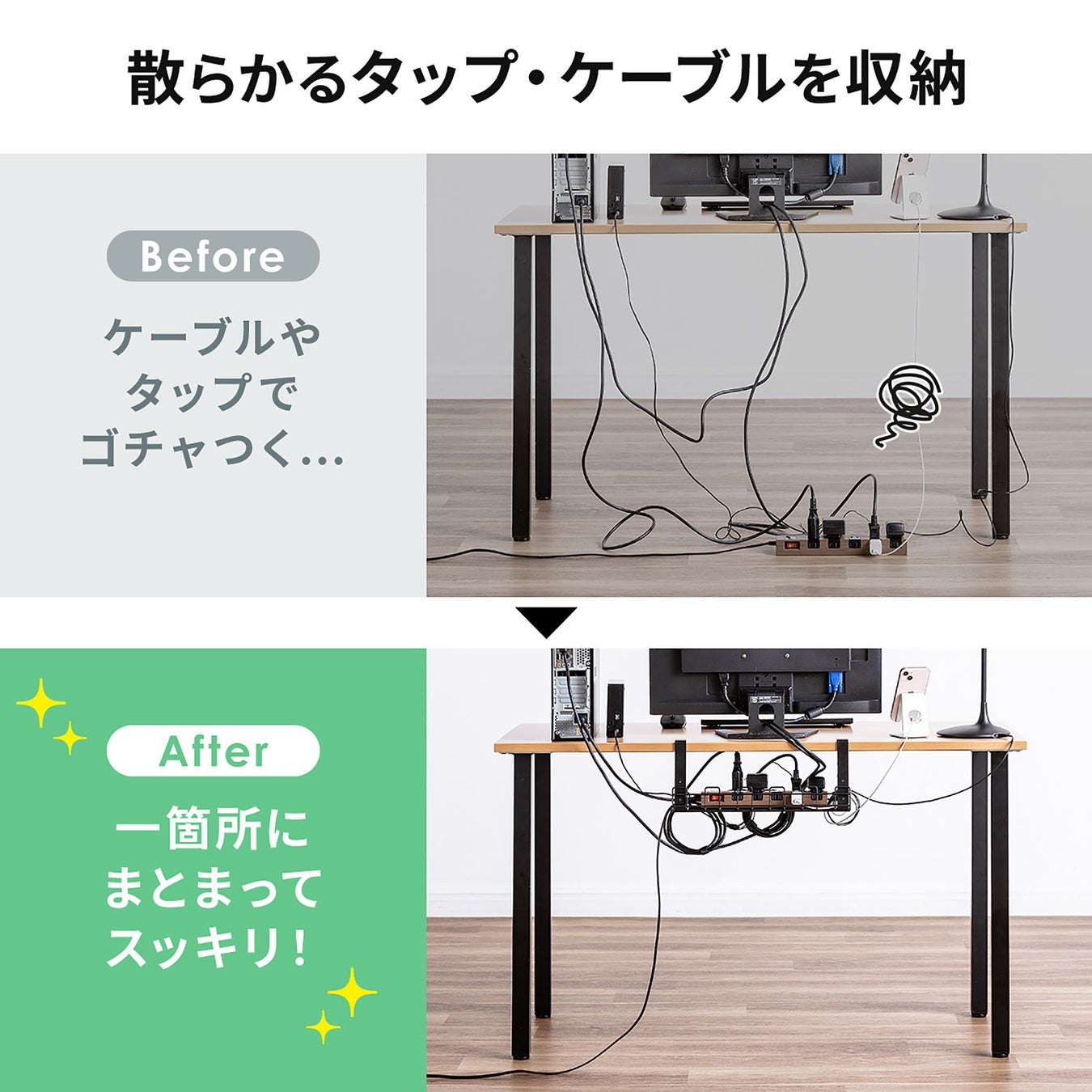 本製品は、電源タップとケーブルを一緒に収納できるケーブルトレーです。ケーブルで散らかりやすいデスク周りを整理することができます。