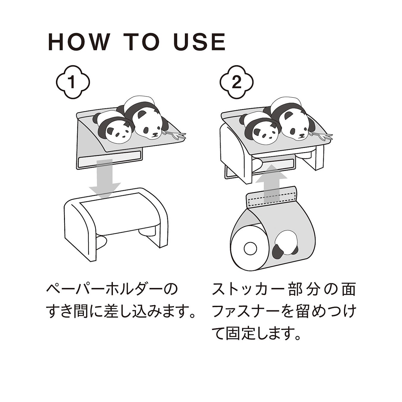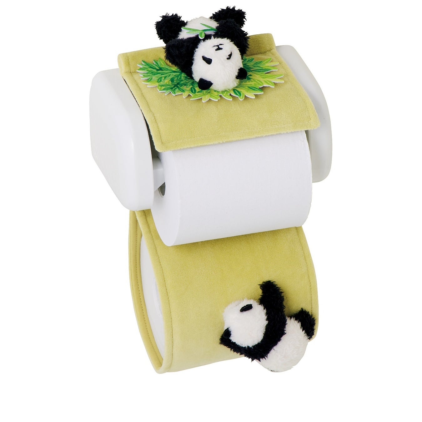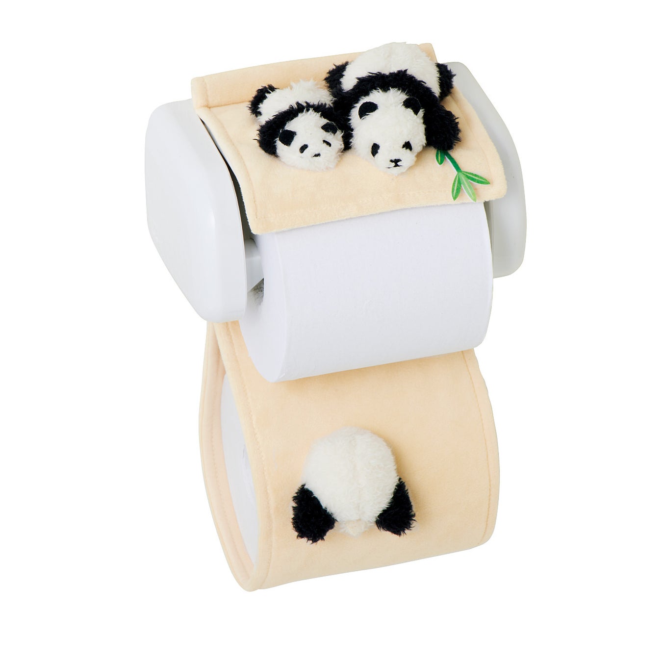 予備ペーパーのストッカー部分には、よじよじする赤ちゃんパンダや、頭をつっこんでいるかわいいパンけつも。健気な姿を毎日見守ることができます。