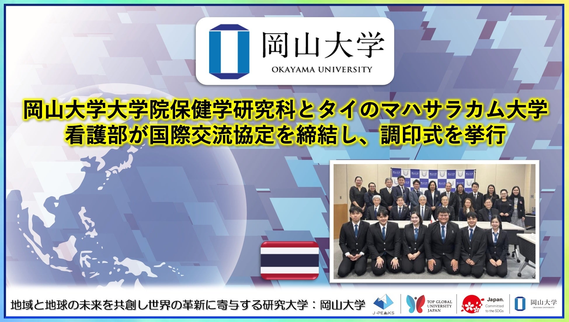 【岡山大学】岡山大学大学院保健学研究科とタイのマハサラカム大学看護部が国際交流協定を締結し、調印式を挙行