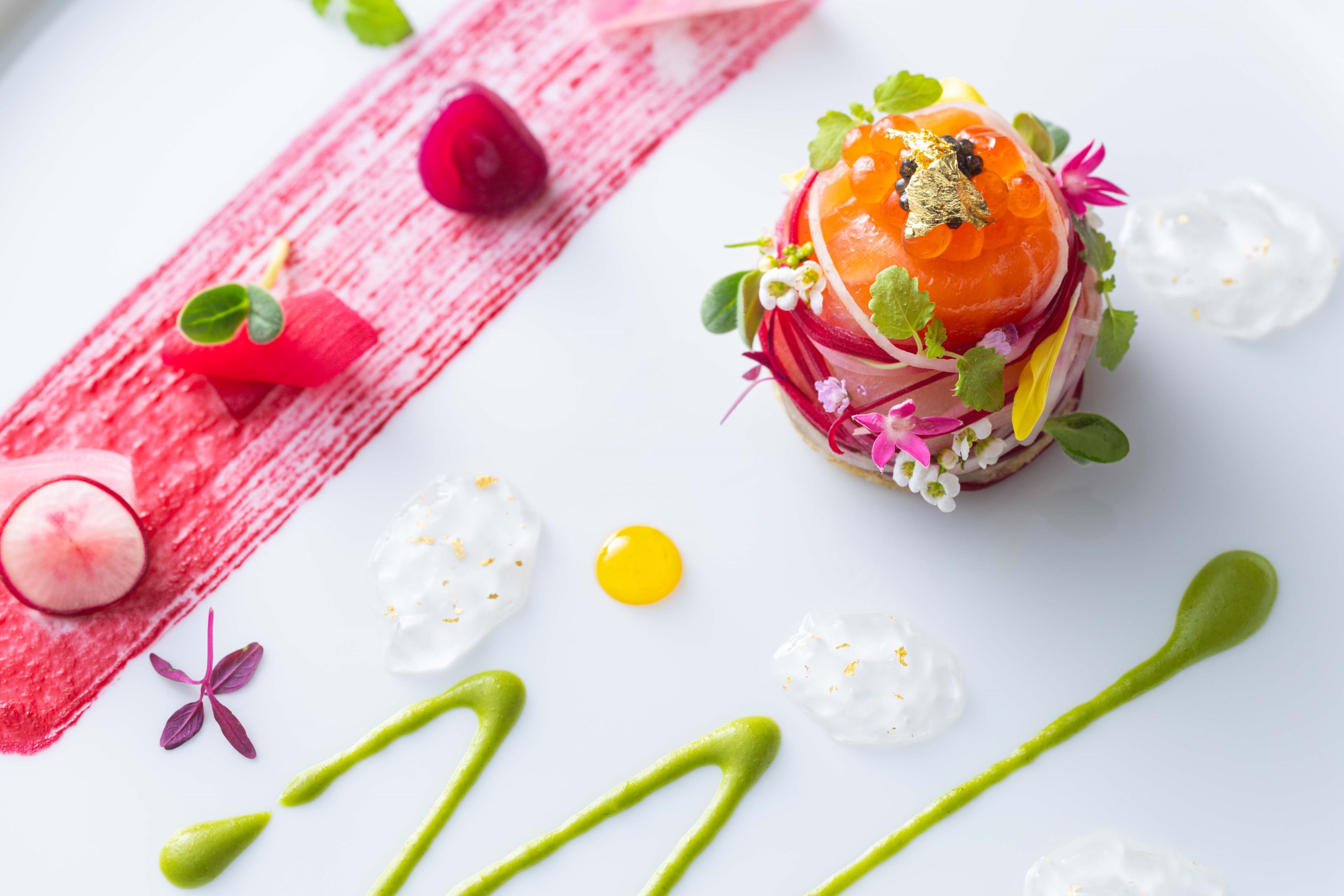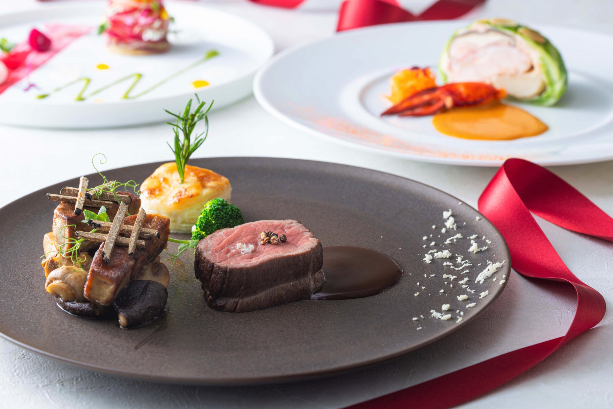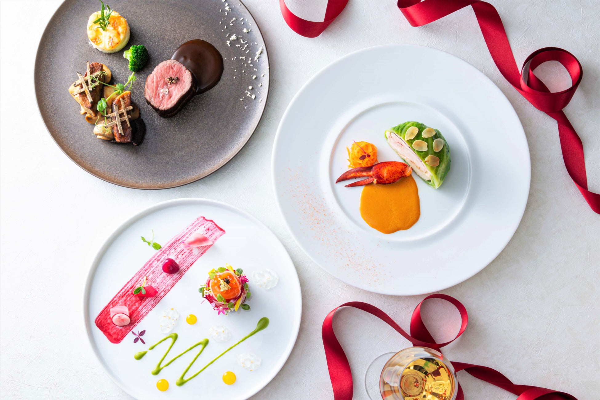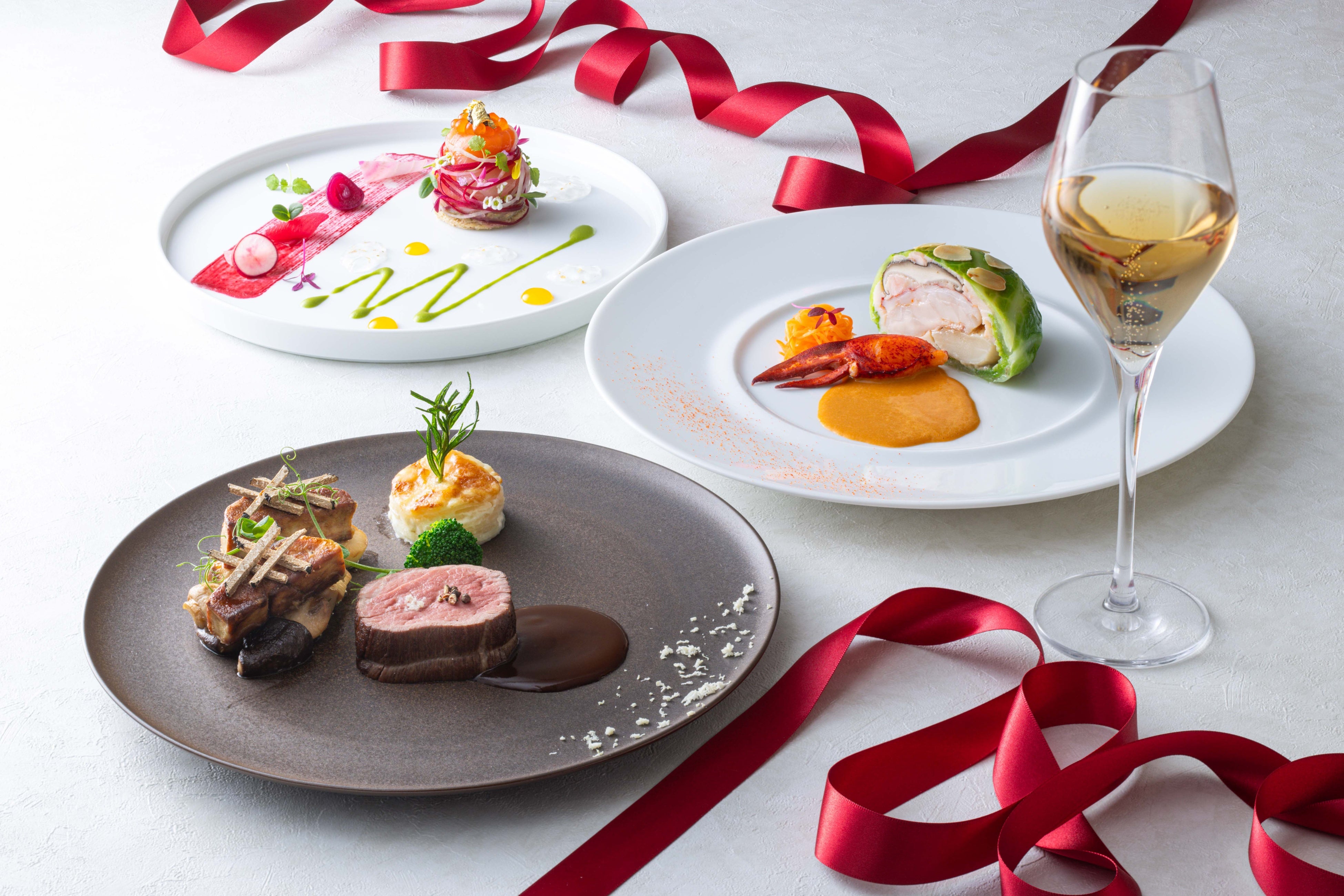 王道のフレンチをモダンに昇華させた、聖夜を彩る限定コースをご用意いたしました。幕開けを飾る前菜は、マリネサーモンや海の幸をエディブルフラワーで可憐に彩り、キャビアと金箔を添えた華やかなツリー仕立てに。メインディッシュには、低温調理で仕上げた国産牛フィレ肉のローストを、フォアグラ、トリュフとともに贅沢に。愛らしいアミューズからきらめくデザートまで、ひと皿ごとに聖夜の物語が紡がれる、心ときめくひとときをお届けいたします。