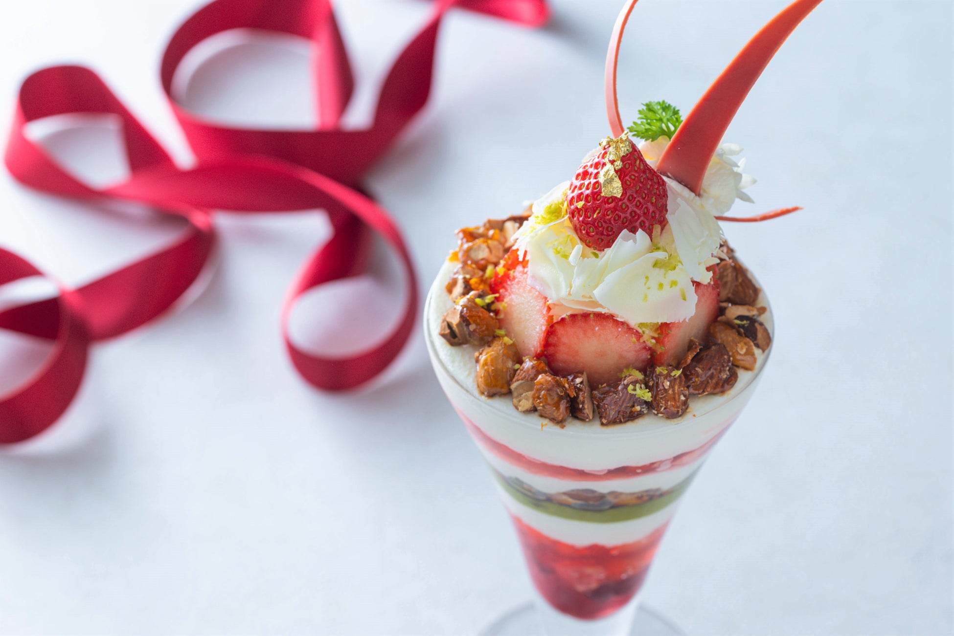ラズベリーとストロベリーの赤、ピスタチオの緑、アイスクリームの白が奏でる、聖夜を彩る限定パフェ。トップには、今年のテーマ、感謝の心を伝えるチョコレートの“赤いリボン”をあしらいました。ナッツのザクザク感とまろやかなクリームに、苺の瑞々しい甘酸っぱさが重なり合う、心躍る味わいをお楽しみください。