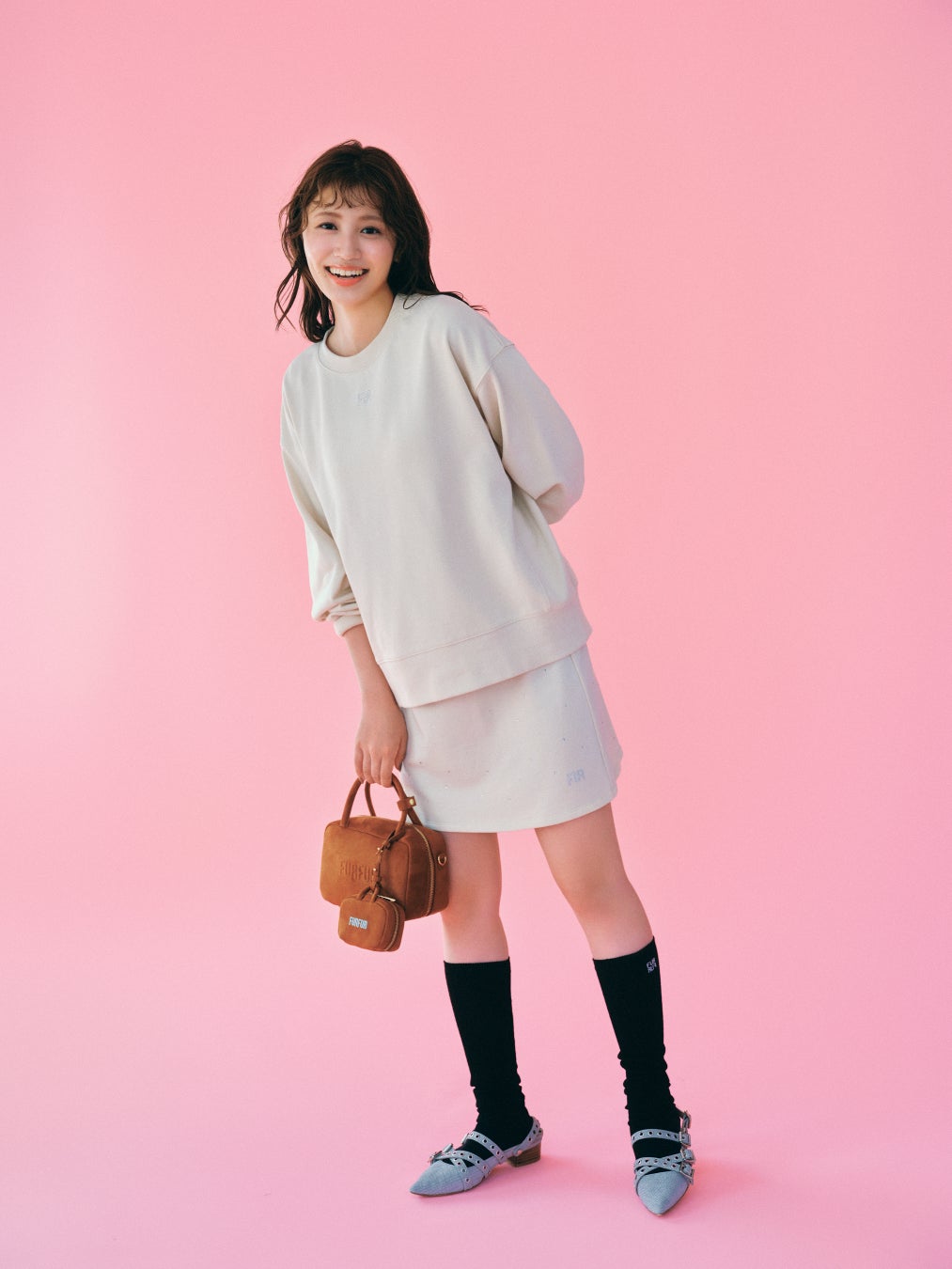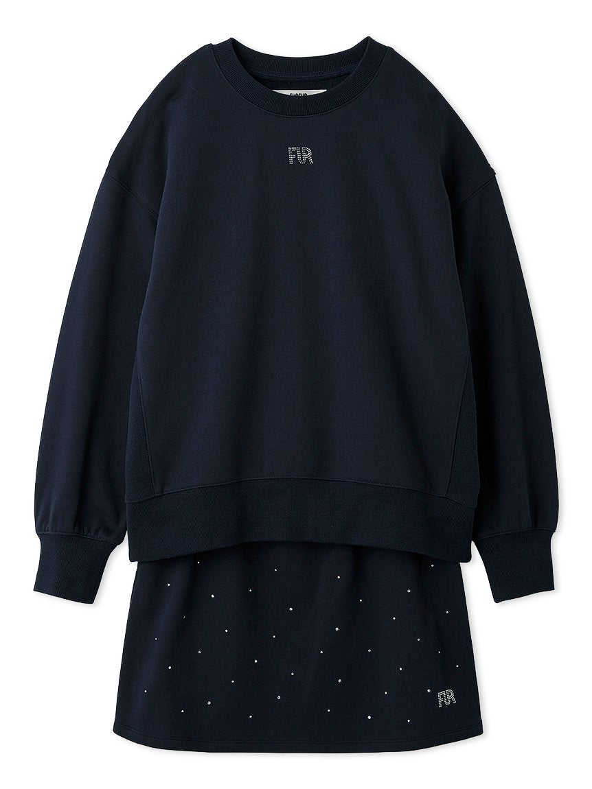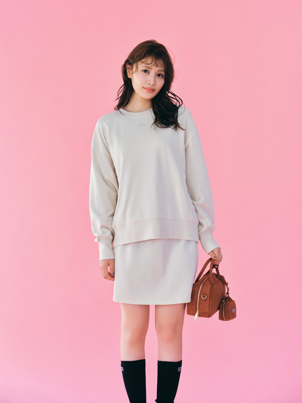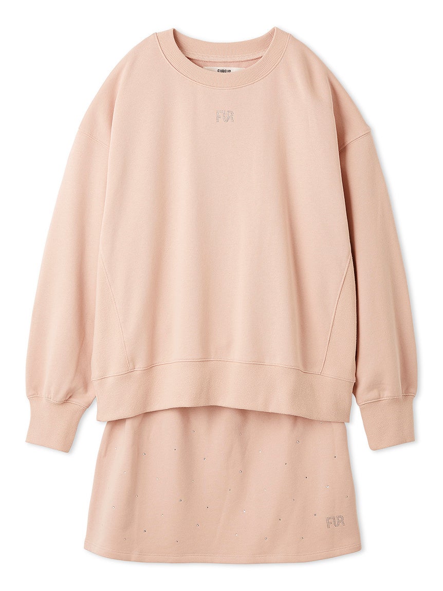 クリスタルを散りばめた、程よい丈感で大人も着やすいスウェットミニスカートがセットになった特別なアイテム。
