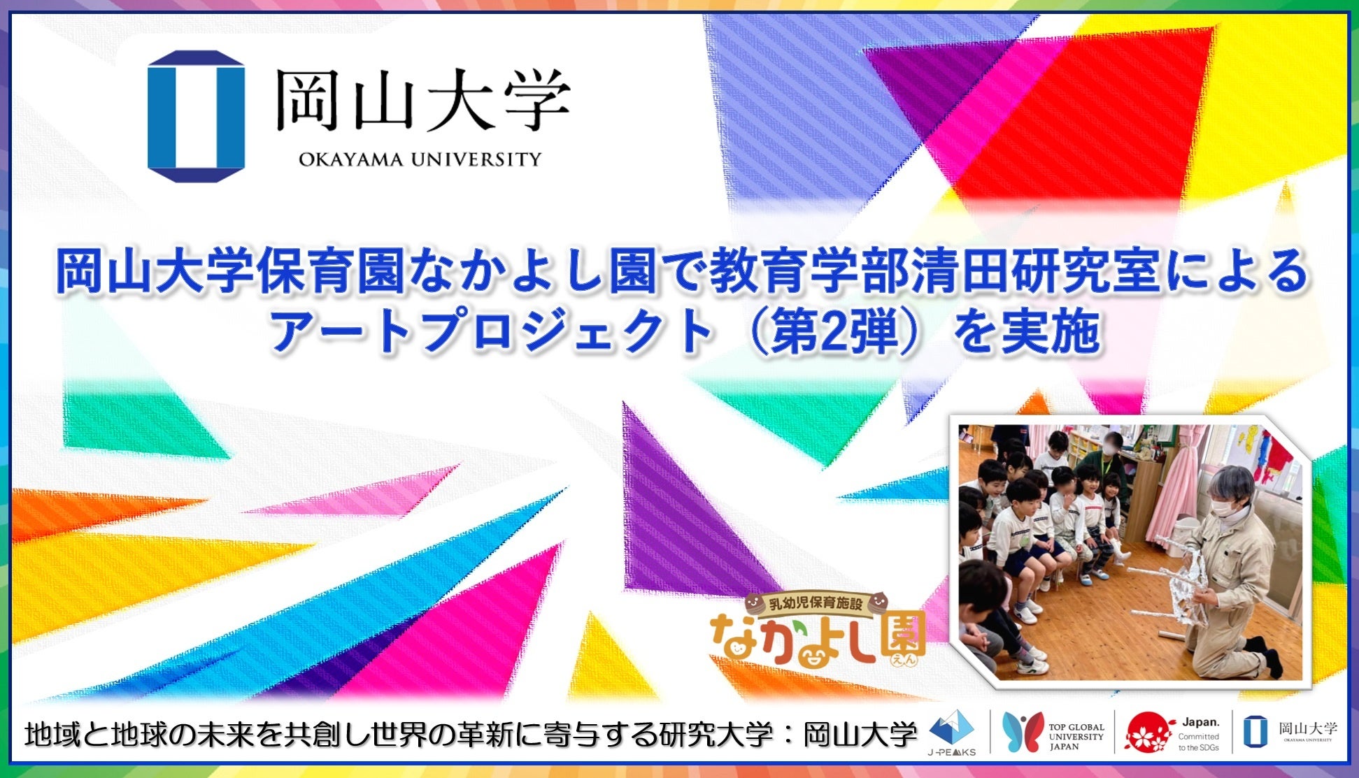 国立大学法人岡山大学(本部:岡山市北区、学長:那須保友)は、2026年2月17日、岡山大学保育所なかよし園(岡山市北区鹿田町)で、教育学部清田研究室によるアートプロジェクト第2弾「キラキラなかよし園」を実施しました。