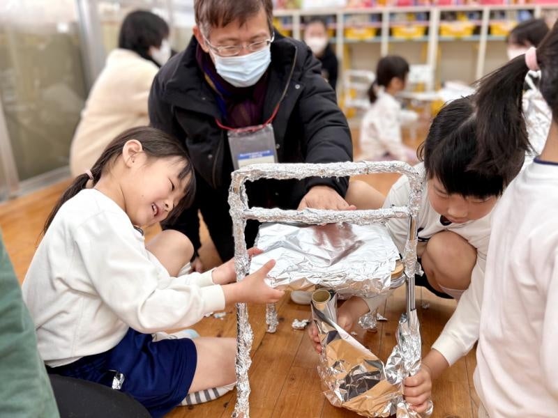 園児たちはアルミホイルを受け取ると、早速作業に移りました。最初は、少しずつアルミホイルをちぎったり、何から始めたらいいかわからず戸惑っている園児の姿も見られましたが、作業を進めていくにつれだんだんと園児たち独自の工夫がみられるようになり、生き生きと制作を進めていくことができました。時間が経つにつれ、作り方を教え合ったり、周りを見て「自分もやってみたい!」とチャレンジする園児たちの姿も見られ、「もっと作りたい!」「楽しすぎる!」という声があちこちから聞こえる、あっという間の1時間となりました。