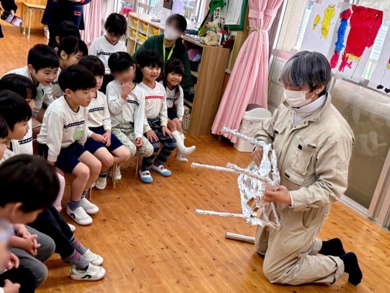 今回実施したのは、園児がいつも使っているイスや、自分のカバン、教室の壁、床などをアルミホイルで覆い、キラキラに変えていくというプロジェクト。清田教授による説明を、園児たちはワクワクした表情で聞き入り、まずは自分のイスをキラキラにすることからスタートしました。