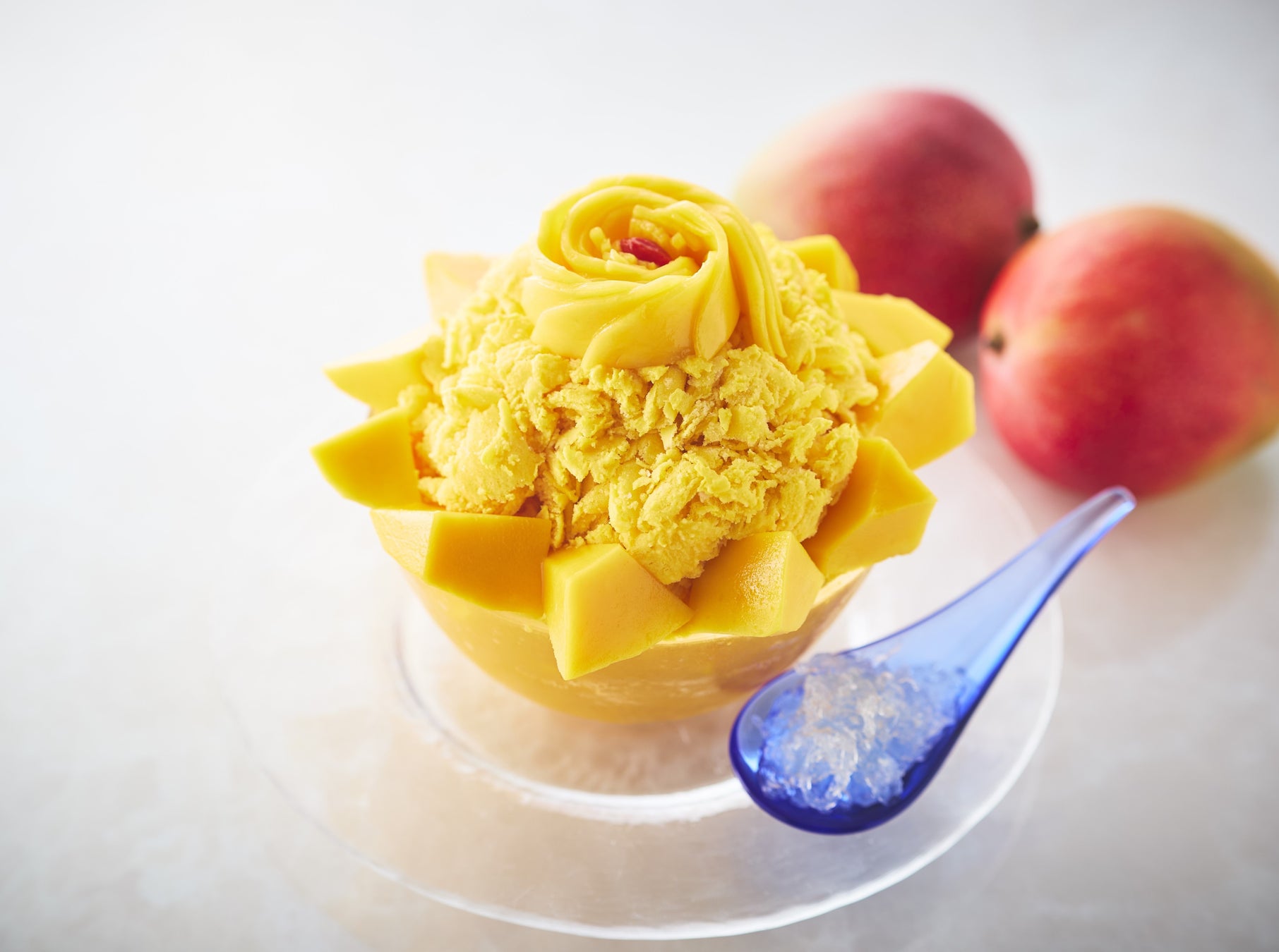 一品目は「燕の巣deマンゴーかき氷」。たっぷりのマンゴープリンの上に、濃厚なマンゴーかき氷と、フレッシュな果肉をこぼれんばかりにトッピングしました。どこを食べても芳醇なマンゴーを味わい尽くせる特別なかき氷です。