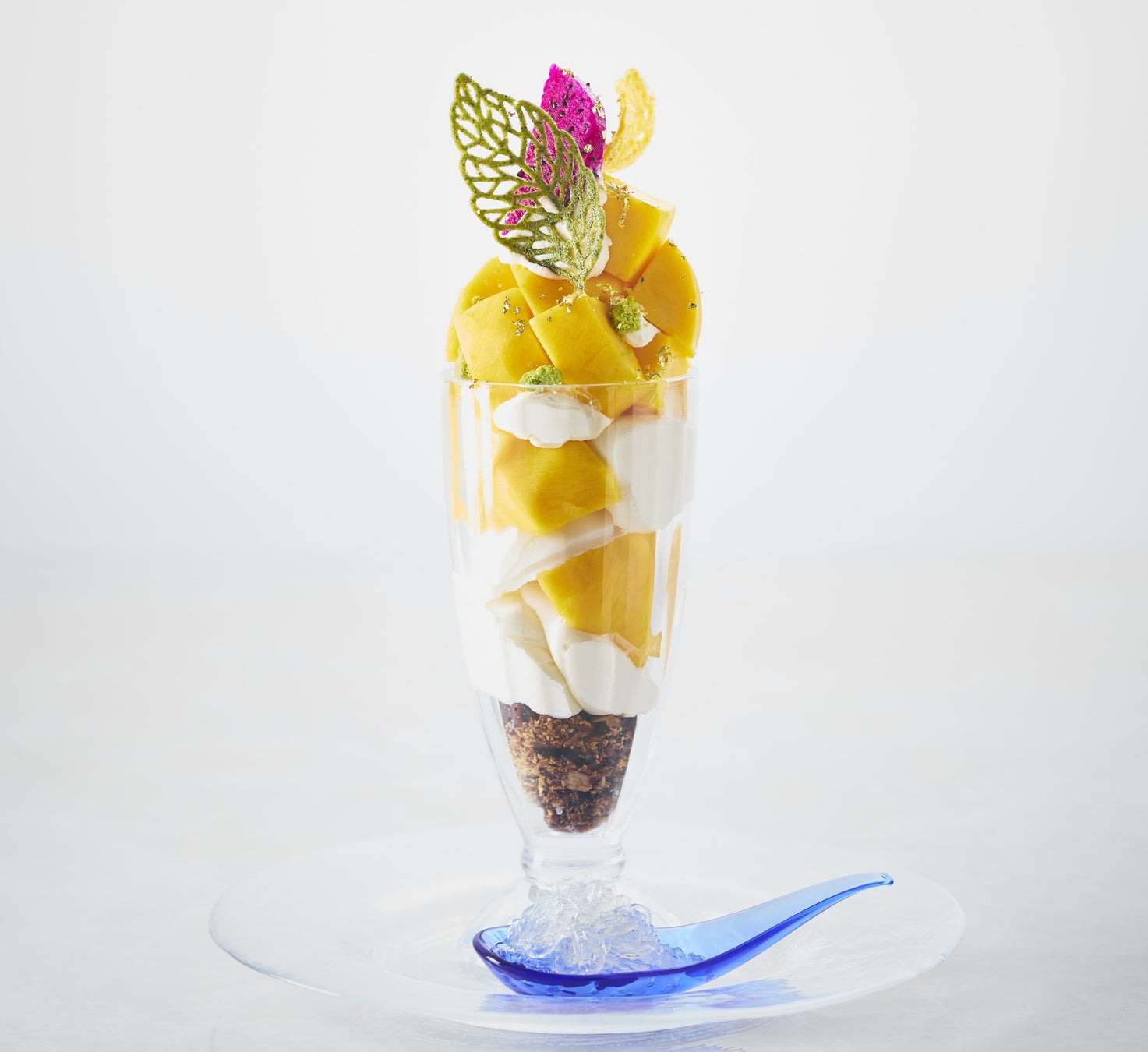 二品目の「燕の巣deマンゴーパフェ」は、美しく層になったリコッタクリームやココナツアイス、生クリーム、中国料理らしいピーカンナッツのキャラメリゼと、たっぷりの完熟マンゴーが織りなす味の広がりをご堪能いただきたい一品です。