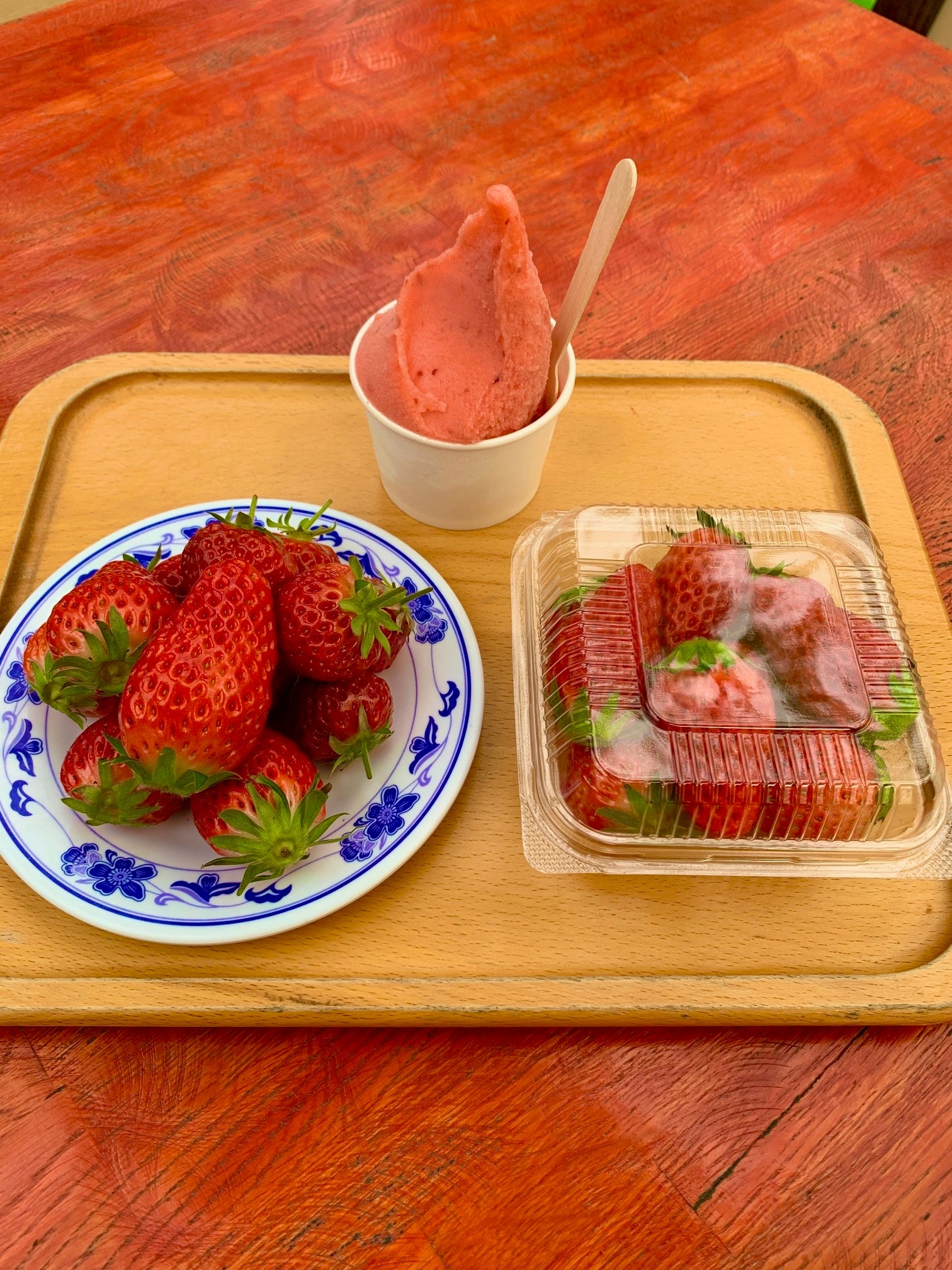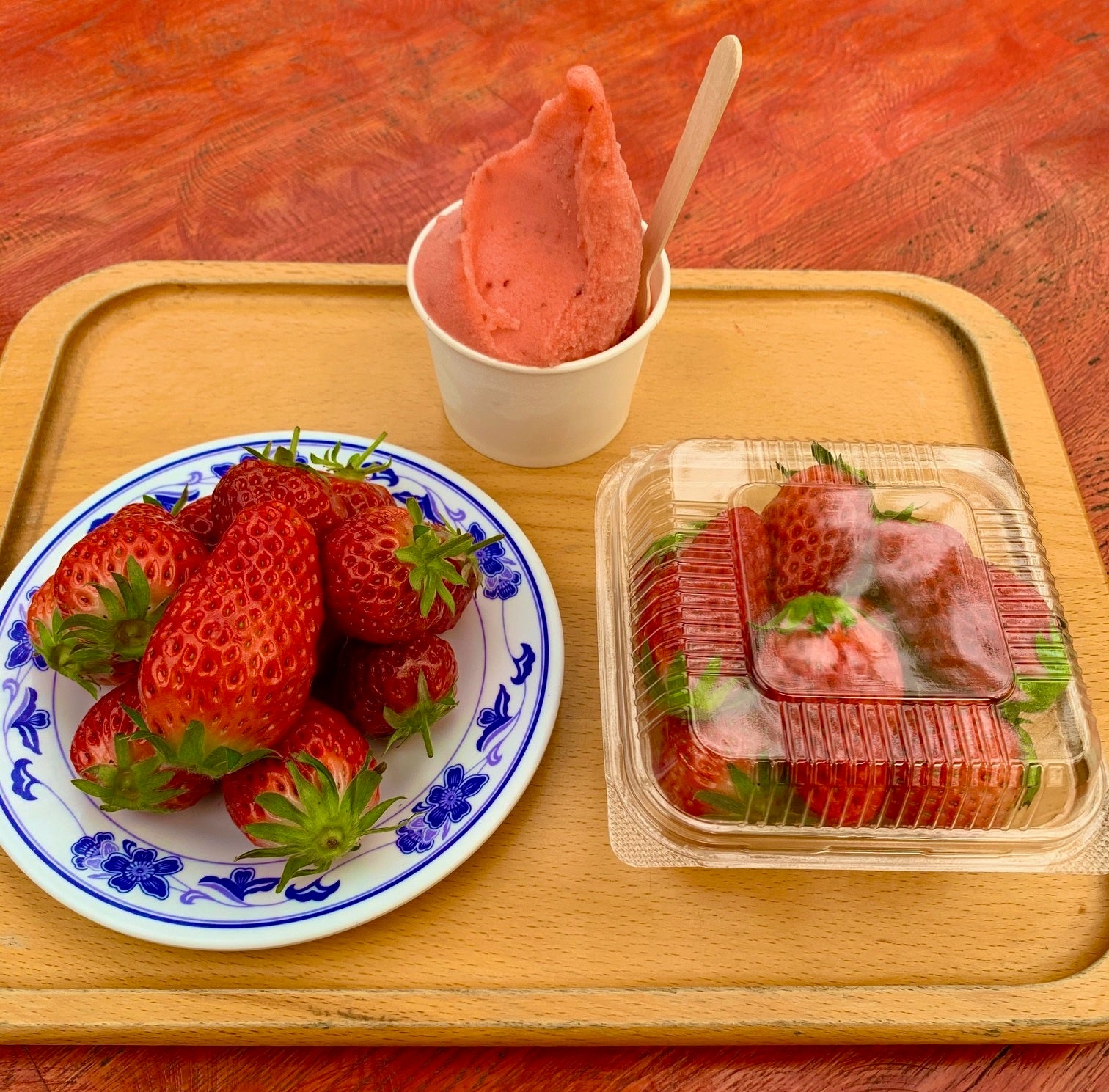 「いちご味比べお皿盛り(10粒前後)+蓋付きミニパックおみやげ収穫(10粒前後)+ジェラート(ダブル)」