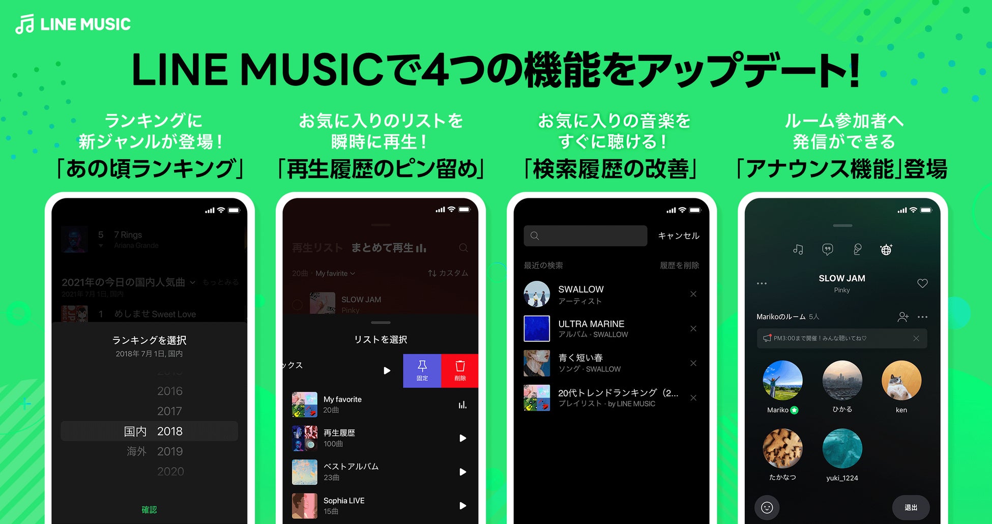 その他、検索履歴の改善や「ルーム(β)」でホストがメッセージを入力できるアナウンス機能の追加など、さらに使いやすく音楽を楽しむことができるサービスへ!