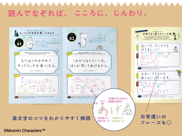ムーミンのお話には、はっとするような名言がいっぱいです。好奇心旺盛なムーミントロール、愛情深いムーミンママ、自由を愛するスナフキン、いつも正直なリトルミイなど大好きなキャラクターのセリフから、じわりと心に響く名言がピックアップされていて、開けばそこにムーミン谷の世界が広がるような、楽しいブックレットです。1ヵ月ごとに1セットずつお届けしていくので、気軽にチャレンジでき、すき間時間で楽しめます。ちょこっとコラムやイラストもたっぷりで、ムーミンの物語にも詳しくなれます。美文字のお手本は名言だけでなく日常に使いやすいフレーズも学べるので、実用的です。
