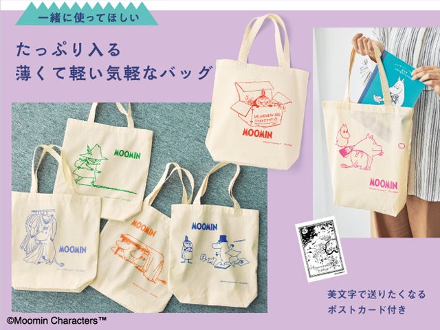 ムーミンたちの個性的な表情が魅力のバッグも合わせてどうぞ。レッスンバッグとして使ったり、おうちのこまごました物の一時保管にもぴったり。薄手だから軽く、サブバッグとして持ち歩きにも便利。たっぷりマチありだから、毎日のお買い物にも。