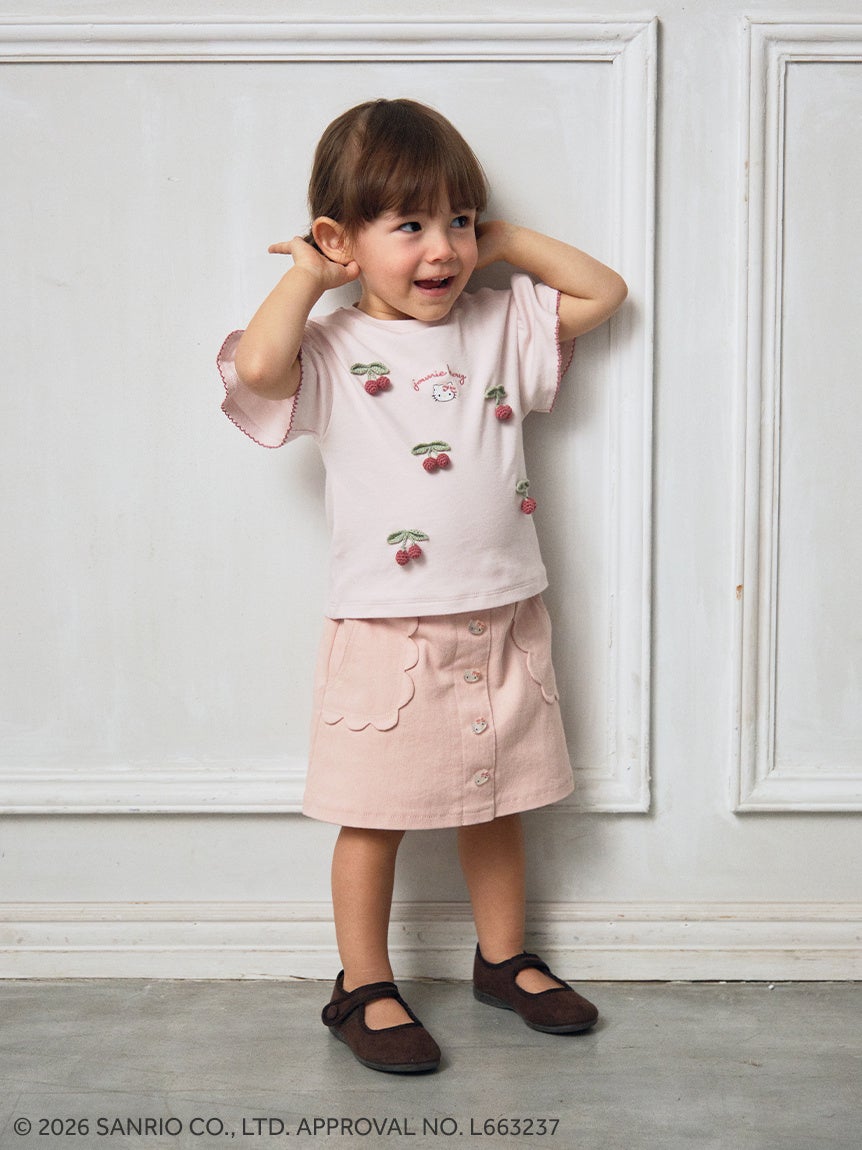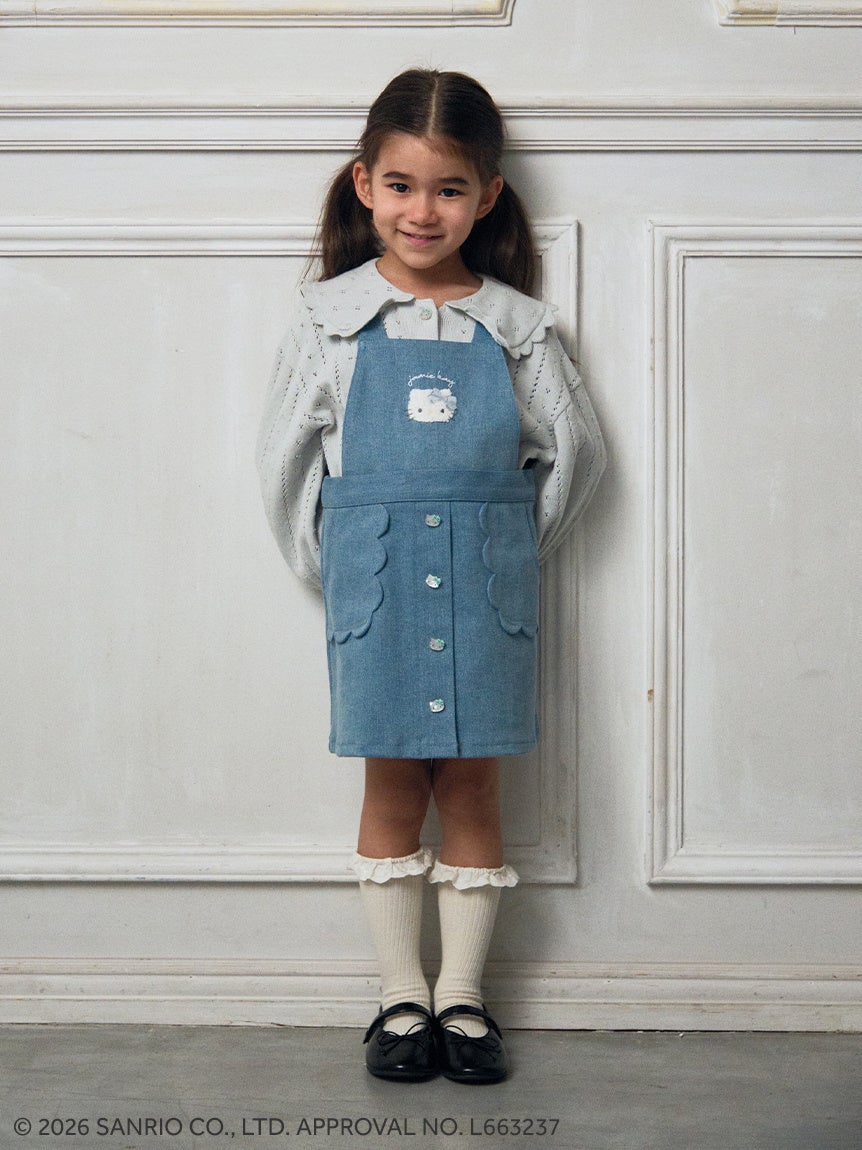 胸元のハローキティ刺繍と立体感のあるかぎ針編みモチーフが目を引くTシャツと、立体的なサガラ刺繍とオリジナルボタンがポイントのジャンパースカート。