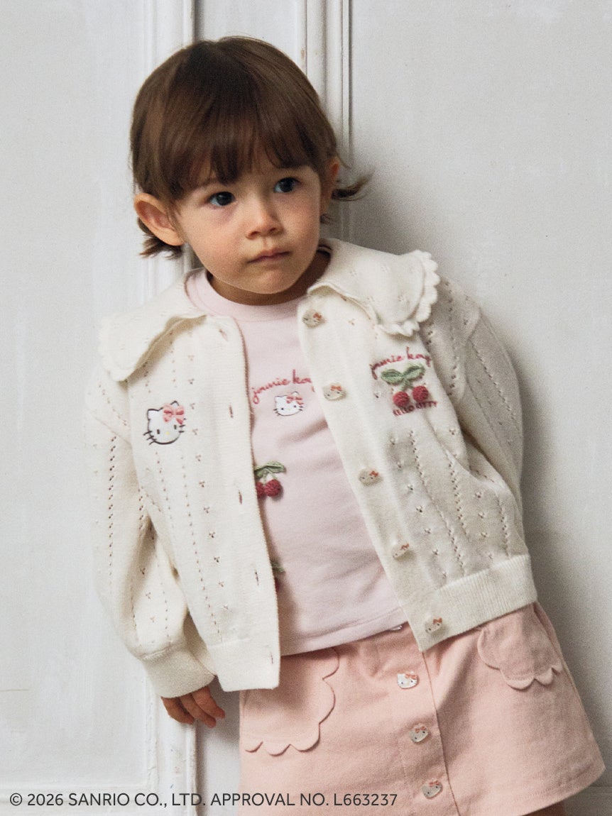 透かし柄が美しい、少し肌寒い時期にさっと羽織れるコットンニットカーディガン。ハローキティの顔のかたちのオリジナルボタンが目を引き、思わず手に取りたくなる愛らしさです。